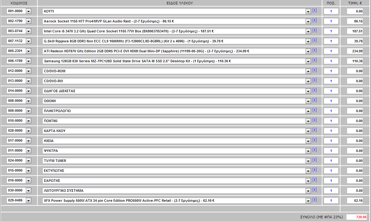takisffff Δημοσ. 23 Νοεμβρίου 2012 Δημοσ. 23 Νοεμβρίου 2012 Γεια σας παιδιά.Προσπαθώ να φτιάξω ένα κουτάκι αλλά έχω ψιλοχαθεί με τόσες επιλογές που έχω.Δεν νομίζω πως πρέπει να συμπληρώσω την φόρμα μιας κ δεν ζητάω να μου προτείνεται κάτι συγκεκριμένο. Το σύστημα προορίζεται για game κ για επεξεργασία ήχου.Η αλήθεια είναι πως έχω σχεδόν καταλήξει στο τι θα πάρω αλλά θέλω κ την συμβουλή σας μήπως κ γλιτώσω χρήματα γιατί έχω ξεφύγει πολύ απ το μπάτζετ των 600 ευρώ. 1η απορία. Επεξεργαστή έχω καταλήξει στον i5-3570.Σκέφτομαι να πάρω τον Κ μιας κ η προοπτική του OC δεν μου είναι αδιάφορη.Το θέμα είναι πως δεν πρόκειται ν ασχοληθώ σοβαρά μαζί του.Εχω να κάνω OC από εποχή πέντιουμ 4 κ δεν διατίθεμαι να διαβάσω απ την αρχή.Αν είναι να κάνω κάτι θα είναι στο auto κ με τον μαμά ανεμιστήρα.Οπως έχω διαβάσει πλέων οι μητρικές έχουν auto tuning.Ισχύει ή δεν έχω καταλάβει καλά?Δίνει κάτι παραπάνω αυτή η μέθοδος ή τσάμπα το σκέφτομαι? Επίσης αν ξέρει κάποιος να μου πει μέχρι πόσο ανεβαίνει ο Κ με τον μαμά ανεμιστήρα? 2η απορία. Μητρική έχω καταλήξει σε Ζ77.Σε σχέση με Η77 τι παραπάνω έχει να μου δώσει? 3η απορία Κάρτα γραφικών θα πάρω μία ΑΤΙ 7870. Πιθανόν αυτή http://www.skroutz.gr/s/447326/Sapphire-Radeon-HD-7870-GHz-Edition-OC-2GB-GDDR5.html Πόσο μεγάλο τροφοδοτικό θα χρειαστώ? Υπολογίστε κ 2Χ 4GB μνήμη 1600Mhz έναν σκληρό 1 ή 2 τέρα, έναν SSD κ DVDR