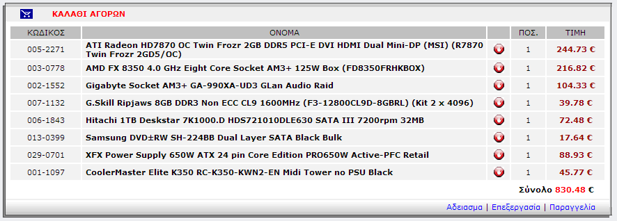 GP7 Δημοσ. 14 Δεκεμβρίου 2012 Δημοσ. 14 Δεκεμβρίου 2012 Κοιταξε αν θελεις το εξης : case: http://www.mgmanager.gr/thermaltake_commander_msi_midi_tower_usb_0_vn400a1w2n/el/pid/11913/ 53 E cpu: http://www.mgmanager.gr/amd_fx_820_50ghz_8core_socket_am_fd820frhkbox/el/pid/9737/ 172 E mobo: http://www.mgmanager.gr/gigabyte_70aud_sata_usb_atx_sam_ga70aud/el/pid/261/ 91 E ram: http://www.mgmanager.gr/corsair_vengeance_8gb_kit_2x4gb_ddr_1600mhz_low_profile_cml8gxm2a1600c/el/pid/7281/ 44 E gpu: http://www.e-shop.gr/show_per.phtml?id=PER.516948 169 E ssd: http://www.mgmanager.gr/intel_ssd_180gb_0_series_sata_retail_ssdsc2ct180ak5/el/pid/6786/ 121 E hdd: http://www.mgmanager.gr/western_digital_caviar_blue_1tb_5_sata_64mb_7200rpm_wd10ezex/el/pid/8727/ 73 E psu: http://www.computerbeast.gr/catalogue?page=shop.product_details&flypage=flypage.tpl&product_id=80889&category_id=893 62 E dvd: http://www.mgmanager.gr/lg_gh24ns5_dvdrrw_dl_24x_sata_mdisc_black_bulk/el/pid/11749/ 18 E Συνολο 803 Ε.. Διαμορφωσα τη συνθεση εχοντας υποψην οτι θα ασχοληθεις και με rendering. Αν παλι σκοπος του pc ειναι μονο το gaming, μπορεις να πεσεις σε επεξεργαστη (ή/και μητρικη) και να ανεβεις σε καρτα γραφικων.. Η συνθεση ειναι κατα βαση απ΄το mgmanager, εκτος της καρτας γραφικων που ειναι απο προσφορα του eshop (η οποια θα ισχυει μονο για 2 ακομα μερες, οποτε αν σε ενδιαφερει, βιασου!), και το τροφοδοτικο απ΄το computerbeast μιας και το mgmanager δεν εχει σχεδον καθολου τροφοδοτικα.. Αν εισαι απο αττικη, μπορεις να γλιτωσεις τα μεταφορικα μιας και ολες τις επιλογες μπορεις να τις βρεις εντος Αττικης.. Τελος, o ssd που σου εβαλα δεν ειναι ετοιμοπαραδοτος, αλλα μπορεις να τον προμηθευτεις ειτε απο αλλο καταστημα, ειτε (αν δεν τον χρειαζεσαι αμεσα) να κανεις λιγη υπομονη.. Για οθονη ποσα χρηματα μπορεις να διαθεσεις? 1