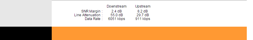 Link Status Connected Modulation Type ADSL_2plus Actual Rate (Up/Down) 874/13038 kbps Attainable Rate (Up/Down) 1036/14448 kbps Noise Margin (Up/Down) 12/11 dB Line Attenuation (Up/Down) 11.4/18.6 dB Output Power (Up/Down) 12.6/19.3 dBm Data Path (Up/Down) Interleaved/Interleaved Interleave Depth (Up/Down) 8/32 Interleave Delay (Up/Down) 790/483 ms INP (Up/Down) 1.9/0.3 symbols LinkEncap G.992.3_Annex_K_ATM CRC Errors (Up/Down) 0/80 Annex Type AnnexA