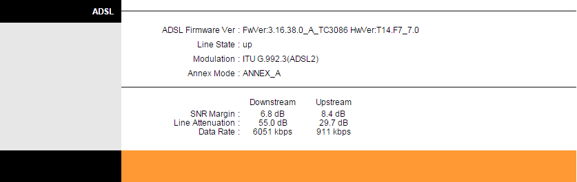 Link Status Connected Rate (Up/Down) 930/15061 kbps Noise Margin (Up/Down) 8.7/6.1 dB Modulation Type ADSL_2plus Line Attenuation (Up/Down) 13.3/22.1 dB Output Power (Up/Down) 12.2/17.4 dBm Data Path (Up/Down) Interleaved/Interleaved Max Rate(Up/Down) 923/16028 kbps