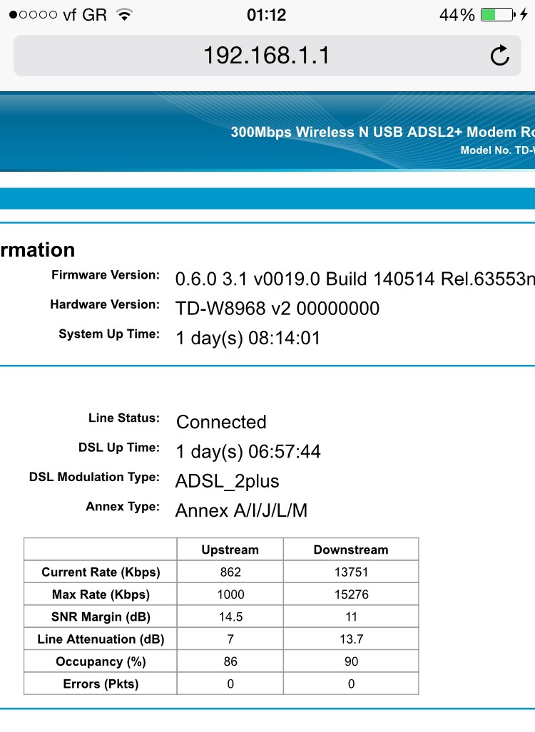 Καλησπέρα... Θα ήθελα να παραθέσω τα στοιχεία της σύνδεσης μου να μου πείτε την άποψη σας για να γνωρίζω τι εχω και αν μπορω να κανω κατι καλύτερο... Σχετικά με το snr margin noise και την ταχύτητα μου... Βέβαια αυτο που βλεπω και απο οτι διαβαςα λιγο στο Ίντερνετ ειναι οτι το occupancy ειναι πολυ υψηλό και οτι καλο ειναι να ήταν πιο μικρό.. Βέβαια αν δεν εχω θέματα με τη γραμμή πειραζει; Να ενημερώσω οτι απο την πρίζα πάει καλώδιο στο φίλτρο και από εκεί πάει στο τηλέφωνο και στο router. Ο πάροχος μου ειναι hol. Τι λέτε;post-204465-0-48298300-1443048307_thumb.jpg