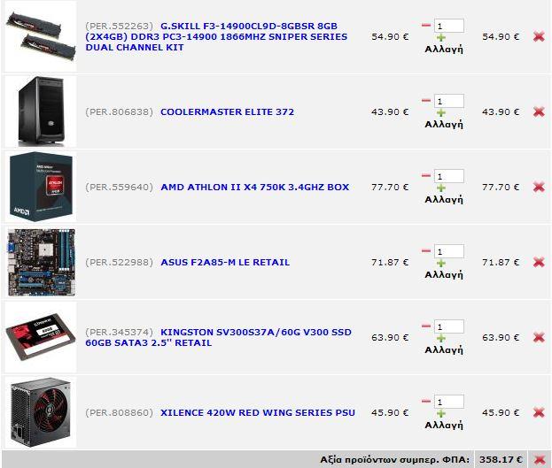 george kesoglu Δημοσ. 25 Ιανουαρίου 2013 Δημοσ. 25 Ιανουαρίου 2013 υποθετω οτι εχεις το κουτι http://www.skroutz.gr/s/2591542/Corsair-Builder-Series-CX430-80Plus-Bronze.html http://www.skroutz.gr/s/2645728/AMD-Athlon-II-X4-740-Box.html http://www.skroutz.gr/s/2554035/Asrock-FM2A75-Pro4-M.html http://www.skroutz.gr/s/339207/Kingston-4GB-1600MHz-DDR3-Non-ECC-CL9-DIMM-Kit-of-2-HyperX-Plug-n-Play.html http://www.skroutz.gr/s/290620/Western-Digital-Caviar-Blue-WD10EALX-1TB.html http://www.skroutz.gr/s/2766780/XFX-Radeon-HD7750-1GB-Core-Edition-DP-Wide-Size.html γυρω στα 360 ευρο 2