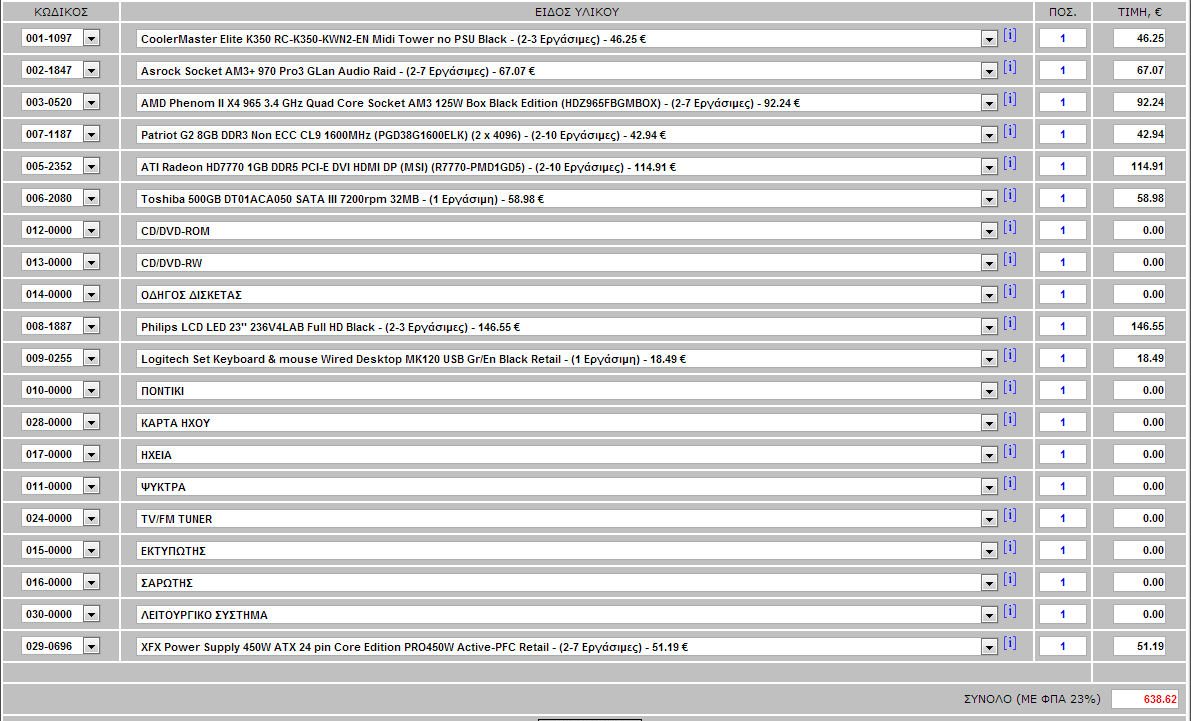 paok4dim Δημοσ. 27 Ιανουαρίου 2013 Δημοσ. 27 Ιανουαρίου 2013 -1 στην συνθεση του george, με το λειτουργικο στον green το συστημα θα σερνεται, οθονη με tn panel σε intel στα χρηματα που δινεις δεν λεει δες μια προχειρη συνθεση http://www.plaisio.gr/ypologistes-anavathmisi/periferiaka/pliktrologia-keyboards/Logitech-MK-220-Wireless-Combo-920-003161.htm http://www.plaisio.gr/ypologistes-anavathmisi/periferiaka/monitor-othones/LG-IPS231P-BN-LED-Monitor-23-IPS231P-BN-AEU.htm http://www.visionstudio.gr/prodinfo.asp?id=32258&cat=4 http://www.visionstudio.gr/prodinfo.asp?id=31574&cat=4 http://www.visionstudio.gr/prodinfo.asp?id=31759&cat=4 http://www.visionstudio.gr/prodinfo.asp?id=32091&cat=4 Site: http://www.visionstudio.gr/prodinfo.asp?id=27534&cat=4">http://www.visionstudio.gr/prodinfo.asp?id=27534&cat=4 http://www.visionstudio.gr/prodinfo.asp?id=32525&cat=4 Βγαινει λιγο κατω απο τα 600€ αλλα το συστημα ειναι κομπλε, το καλοκαιρι παιρνεις και εναν ssd και εισαι οκ ΥΓ επελεξα το visionstudio λογω της ποικιλιας σε μητρικες και το κορυφαιο για τα χρηματα του τροφοδοτικο Edit: Εναλακτικα δες και αυτο το σετ http://www.visionstudio.gr/prodinfo.asp?id=32736&cat=4 http://www.visionstudio.gr/prodinfo.asp?id=29123&cat=4 http://www.visionstudio.gr/prodinfo.asp?id=32826&cat=4 με τα υπολοιπα parts ιδια, θα κερδισεις αρκετα σε επιδωσεις στο τομεα του gaming 1
