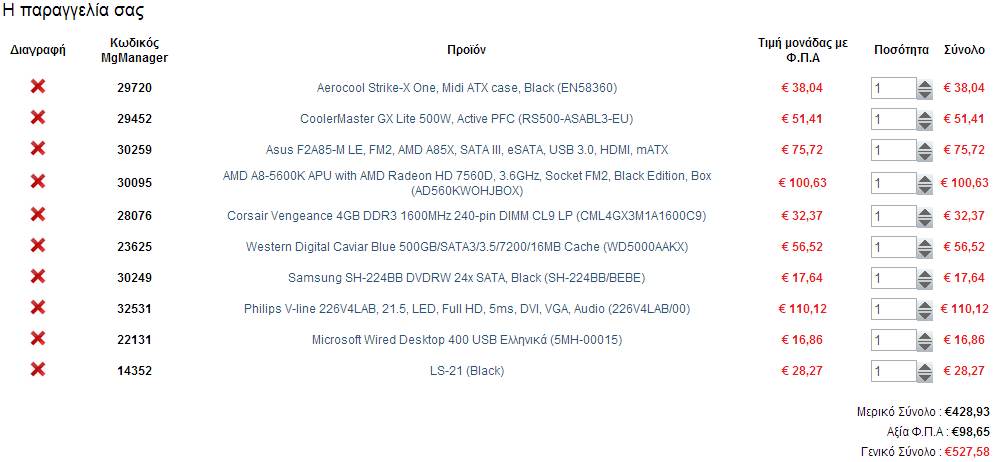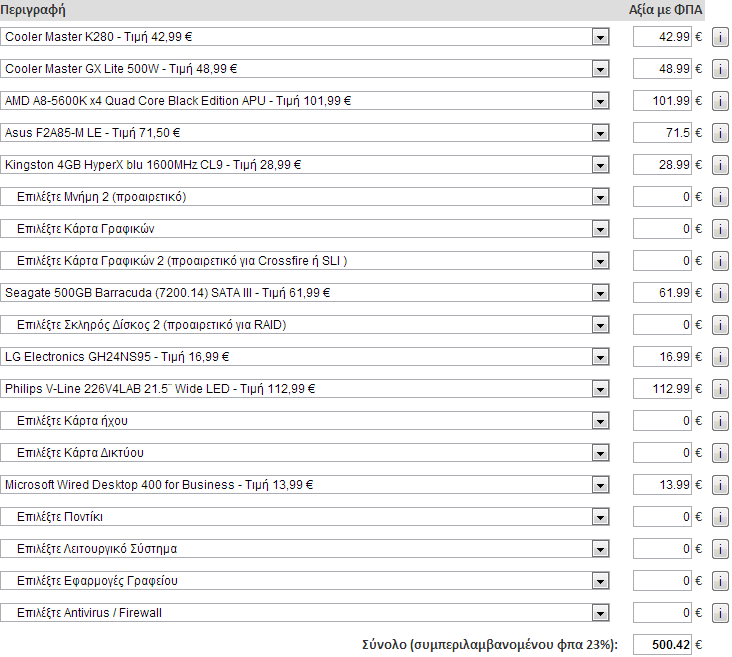 elise Δημοσ. 11 Μαρτίου 2013 Δημοσ. 11 Μαρτίου 2013 Λοιπον παιδες , προσπαθω να φτιαξω και εγω μια συνθεση για εναν καλο μου φιλο με budget το 500αρικο . εχω καταληξει : κουτι : http://www.you.gr/b2c_iqshop/b2c/pd.do?pg=E22D750900B67CF1ADECD8D3859717C0&pa=6FD3150E4974A34A86E292EFC91B8F23 cpu : http://www.plaisio.gr/ypologistes-anavathmisi/anavathmisi-ypologisti/cpu-epeksergastes/Intel-Core-i3-3220-1155-3-3GHz-3MB-11191-30-20G.htm RAM : http://www.visionstudio.gr/prodinfo.asp?id=22519&cat=4 HDD : http://www.visionstudio.gr/prodinfo.asp?id=26313&cat=6&sub=12&pmanuf=undefined&sort=3&step=undefined MONITOR : http://www.msystems.gr/index.php?category=2323&product=13636 DVD : http://www.you.gr/b2c_iqshop/b2c/pd.do?pg=E2071811D802DAF197DF1CC1DEEF978D&pa=39895C592446F0409DA70767F817EE87 MOBO : http://www.you.gr/b2c_iqshop/b2c/pd.do?pg=E1589BDA575D05F19B8F0014C2625C7B&pa=56CA86ADE52CEF4AADDCE2DEB8D98694 PSU : http://www.visionstudio.gr/prodinfo.asp?id=25189&cat=17 οποιες παρατηρησεις φυσικα δεκτες. το ερωτημα ειναι : με λειτουργικο τι γινεται; επειδη πρεπει να κοπει τιμολογιο, πως πρεπει να κινηθουμε;