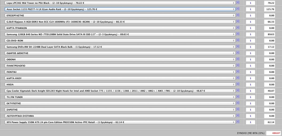 Donatos Diamantis Δημοσ. 6 Ιουνίου 2013 Δημοσ. 6 Ιουνίου 2013 Μητρική: http://www.e-shop.gr/product?id=PER.522902 Κουτί: http://www.e-shop.gr/product?id=PER.806926 Μνήμη RAM: http://www.e-shop.gr/product?id=PER.556216 Κάρτα γραφικών: http://www.e-shop.gr/product?id=PER.510462 Τροφοδοτικό: http://www.e-shop.gr/product?id=PER.549980 Ψύχτρα: http://www.e-shop.gr/product?id=PER.806759 SSD: http://www.e-shop.gr/product?id=PER.552831 Σκληρός δίσκος: http://www.e-shop.gr/product?id=PER.301911 DVD: http://www.e-shop.gr/product?id=PER.321033 Σύνολο 730€ υπερβένει λίγο το budget σου, αλλά θα σε βολέψει 1