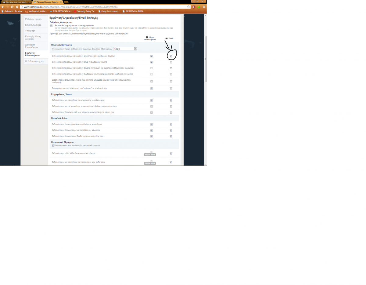veteranos123 Δημοσ. 20 Ιουνίου 2013 Δημοσ. 20 Ιουνίου 2013 Μπορώ να σε βοηθήσω για το πρώτο ερώτημα. Πας στο profil σου στην επιλογή "επεξεργασία profil" και μετά εκεί που λέει ¨επιλογή ειδοποιήσεων" και ξετικάρεις αυτό που έχω κυκλώσει στην φωτογραφία.