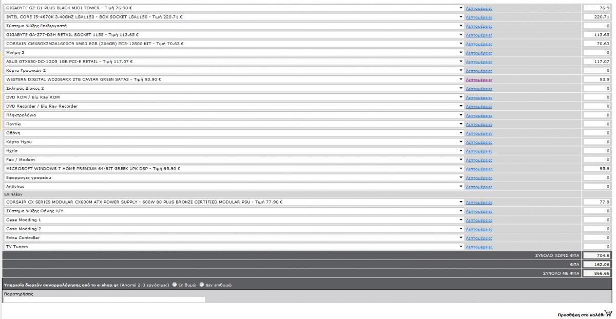 beetlebum Δημοσ. 3 Σεπτεμβρίου 2013 Δημοσ. 3 Σεπτεμβρίου 2013 γεια σας και πάλι παιδιά! τον τελευταίο χρόνο προσπαθώ να το πάρω απόφαση οτι ήρθε η ώρα για καινούργιο υπολογιστή! Τον θέλω για εφαρμογές Adobe suite και ξεκινάω με κουτί, τροφοδοτικό και μνήμη αρχικά. ΤΟ παραθέτω προς το παρόν σε αυτήν την ενότητα αν έχω κανει λαθος ενημερώστε με Ακούω γνώμες γιατί εχω πελαγώσει.. κουτι http://www.e-shop.gr/product?id=PER.640224 http://www.plaisio.gr/ypologistes-anavathmisi/anavathmisi-ypologisti/pc-cases-koutia/Corsair-Carbide-400R-Gaming-case-Midi-Tower-Black-CC-9011011-WW.htm http://www.eworld.com.gr/products/details/2643/# http://www.e-shop.gr/product?id=PER.808793 http://www.e-shop.gr/product?id=PER.640662 http://www.e-shop.gr/product?id=PER.810807 http://www.e-shop.gr/product?id=PER.640734 http://www.e-shop.gr/product?id=PER.806802 ραμ http://www.e-shop.gr/product?id=PER.550382 http://www.e-shop.gr/product?id=PER.552666 http://www.e-shop.gr/product?id=PER.549298 http://www.e-shop.gr/product?id=PER.549226 http://www.e-shop.gr/product?id=PER.552664 τροφοδοτικο http://www.e-shop.gr/product?id=PER.641153 http://www.e-shop.gr/product?id=PER.807687 http://www.e-shop.gr/product?id=PER.808792