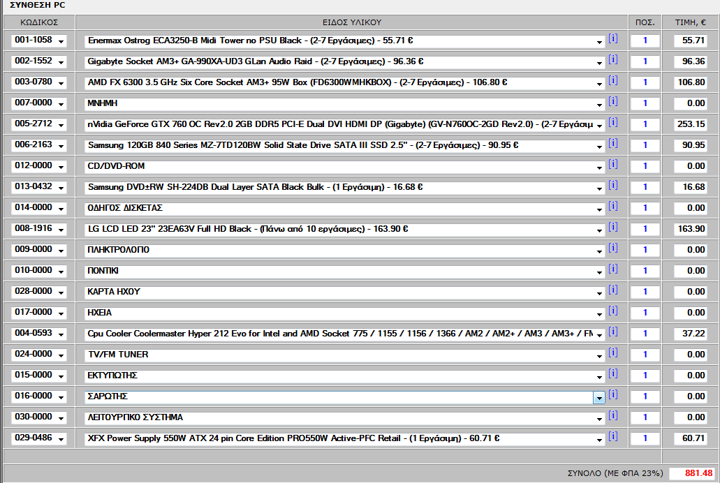 nikolas V Δημοσ. 16 Σεπτεμβρίου 2013 Μέλος Δημοσ. 16 Σεπτεμβρίου 2013 Ποσό που διαθέτουμε : 1000 € max Χρήση υπολογιστή : gaming Ειδικά προγράμματα που θα χρησιμοποιήσουμε: lol,dota Αν στη σύνθεση χρειαζόμαστε οθόνη? Αν όχι ποια οθόνη έχουμε και αν σκεφτόμαστε να αγοράσουμε μελλοντικά μια άλλη. χρειαζομαι οθονη Αν στη σύνθεση χρειαζόμαστε και πληκτρολόγιο,ηχεία,ποντίκι? οχι δε χρειαζεται Τοποθεσία στην οποία βρισκόμαστε ( για την επιλογή κατάλληλου καταστήματος). θεσσαλονικη Αν τα κομμάτια που θέλουμε να αγοράσουμε θέλουμε να είναι απο ένα κατάστημα ή επιθυμούμε την αγορά απο διαφορετικά καταστήματα? καλυτερα απο ενα Αν επιθυμούμε να συναρμολογηθεί το σύστημα στο κατάστημα(στην περίπτωση που δεν γνωρίζουμε πως να το συναρμολογήσουμε) ή το σύστημα θα στηθεί απο τον ενδιαφερόμενο? θα το στησω εγω! Αν επιθυμούμε λειτουργικό σύστημα και πιο . εχω λειτουργικο! oc δεν με ενδιαφερει!