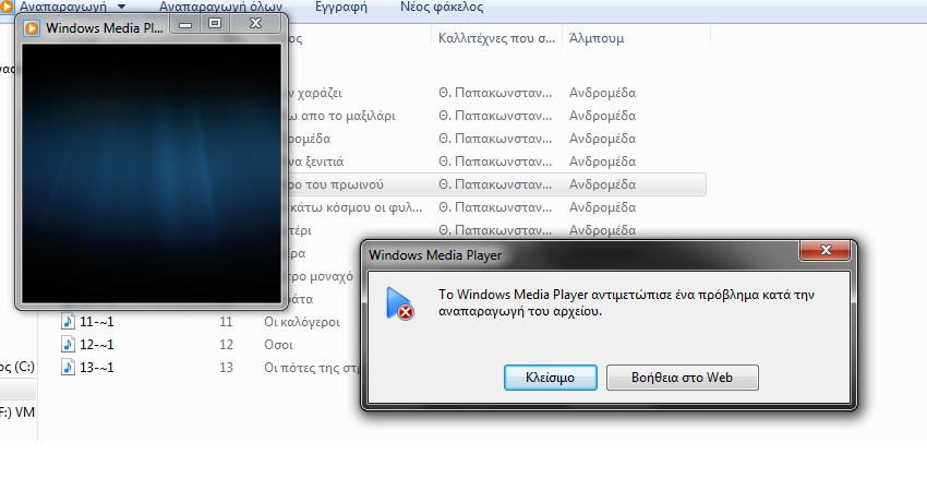MauMaus Δημοσ. 15 Οκτωβρίου 2013 Δημοσ. 15 Οκτωβρίου 2013 Βασικα μολις βαζω ενα αρχειο mp3 για αναπαραγωγη μου βγαζει το παρακατω μηνυμα με το wmedia player , και δεν ακουγεται τιποτα. Αλλα καποιες φορες φτιαχνει και παιζουν κανονικα ολοι οι ηχοι δεν ακουγεται τιποτα - γιατι δεν αναπαραγεται τιποτα ! παιζουν κανονικα ολα -επειδη αναπαραγεται το τραγουδι ! αλλαξε player δεν εχει κανενα προβλημα ηχου το λαπτοπι σου