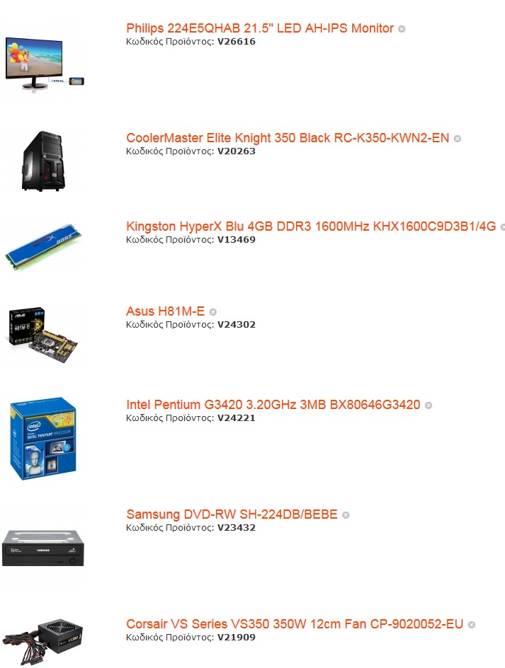 Hyphen Δημοσ. 10 Απριλίου 2014 Δημοσ. 10 Απριλίου 2014 Δεν μου αρεσουν ολες οι επιλογες. Εχουμε εναλλακτικες συνθεσεις; Δες εδω cpu http://www.skroutz.gr/s/3765353/Intel-Pentium-G3420.html mobo http://www.skroutz.gr/s/3761171/Asus-H81M-E.html ram http://www.skroutz.gr/s/369745/Kingston-4GB-1600MHz-DDR3-Non-ECC-CL9-DIMM-HyperX-Blu.html psu http://www.skroutz.gr/s/412893/Thermaltake-Munich-430W.html case http://www.skroutz.gr/s/2364819/CoolerMaster-K350-Window.html dvd http://www.skroutz.gr/s/3544991/Samsung-SH-224DB.html ssd http://www.skroutz.gr/s/3731583/Samsung-840-Series-Evo-120GB.html Συνολο 302 ευρω! Οθονη παρε αυτην http://www.skroutz.gr/s/4301235/Philips-224E5QHAB.html