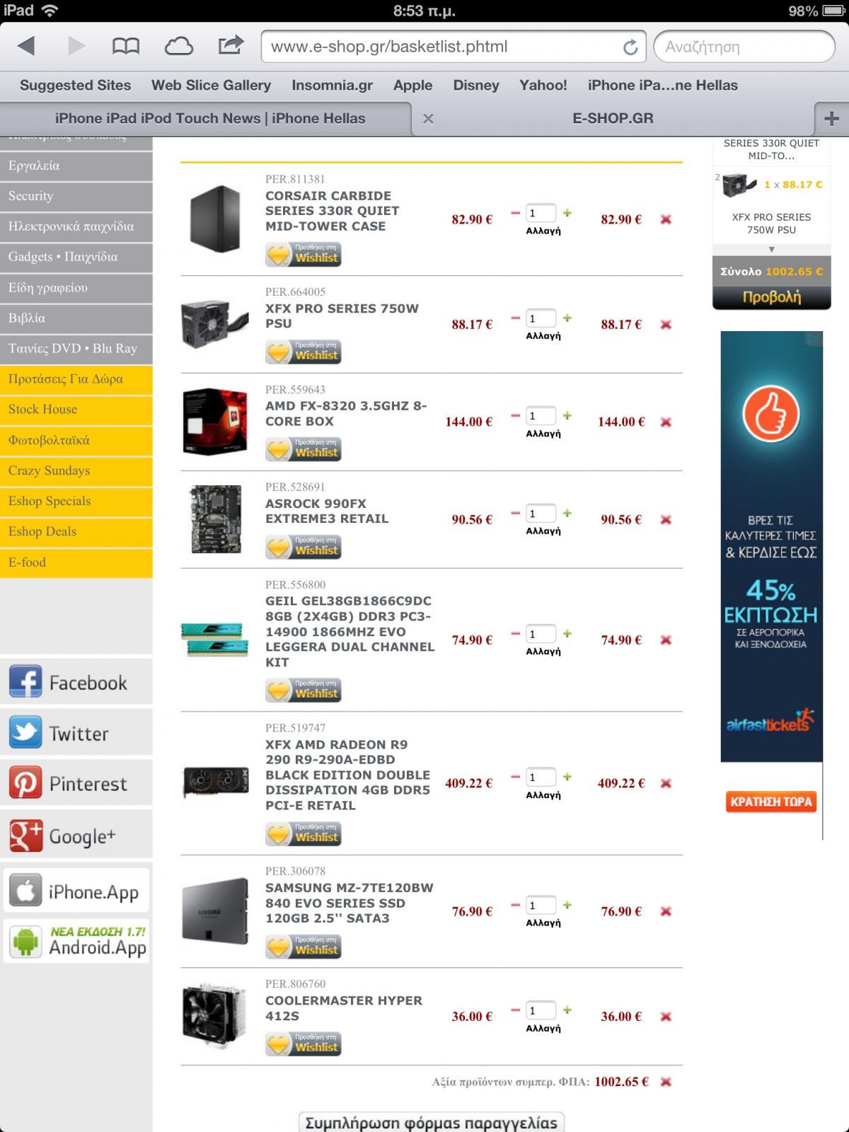 geotrvs Δημοσ. 13 Μαΐου 2014 Δημοσ. 13 Μαΐου 2014 Καλησπερα σε ολους...θελω να με βοηθησετε να δω αν θα παω για αναβαθμιση ή για ολικη αλλαγη. το pc που εχω το ειχα φτιαξει το 2008 και τωρα νομιζω οτι ηρθε ωρα για ενα φρεσκαρισμα(ή αλλαγη αν δεν μπορω να σωσω κατι) λοιπον αποτελειται απο... κουτι...θα αλλαξω σιγουρα και προτιμω αυτο...http://www.digital-master.gr/el-gr/Products.aspx?ElementID=94f0dd33-14a7-4925-9928-1199d8b0da4f τροφοδοτικο...seasonic psu 650w (δεν το βρισκω να σας δειξω ποιο ειναι ακριβως-το αλλαξα πριν 3 χρονια. μητρικη...http://www.newegg.com/Product/Product.aspx?Item=N82E16813131190 επεξεργαστης...http://ark.intel.com/products/33910/Intel-Core2-Duo-Processor-E8400-6M-Cache-3_00-GHz-1333-MHz-FSB ψυκτρα....εργοστασιακη ram...4 gb http://www.e-shop.gr/product?id=PER.554788 σκληρος δισκος...wd 320 και ενα wd 1 tb (ακριβως δεν θυμαμαι ποιοι ειναι) Ποσό που διαθέτουμε : αναλογα τι θα κρατησω μετα απο την βοηθεια σας (αν αξιζει να κρατησω) Χρήση υπολογιστή :ιντερνετ-ταινιες-παιχνιδια (να μπορω να παιζω ανετα χωρις κολληματα) Ειδικά προγράμματα που θα χρησιμοποιήσουμε: οχι Αν στη σύνθεση χρειαζόμαστε οθόνη? οχι εχω την.... http://www.lg.com/uk/monitors/lg-M2232D Αν στη σύνθεση χρειαζόμαστε και πληκτρολόγιο,ηχεία,ποντίκι? οχι Τοποθεσία στην οποία βρισκόμαστε ( για την επιλογή κατάλληλου καταστήματος). Ηρακλειο Κρητης Αν τα κομμάτια που θέλουμε να αγοράσουμε θέλουμε να είναι απο ένα κατάστημα. δεν εχω προβλημα αν ειναι να γλυτωσω χρηματα. Αν επιθυμούμε να συναρμολογηθεί το σύστημα στο κατάστημα(στην περίπτωση που δεν γνωρίζουμε πως να το συναρμολογήσουμε) ή το σύστημα θα στηθεί απο τον ενδιαφερόμενο... θα το στησω εγω Αν επιθυμούμε λειτουργικό σύστημα και ποιο..οχι εχω να επισημανω οτι θελω να ειναι εντελως αθορυβο επειδη το εχω διπλα απο την τηλεοραση και το τωρινο ειναι αρκετα θορυβωδες και οτι ελπιζω να με κρατησει τουλαχιστον 4 χρονια. Σας ευχαριστω ολους εκ των προτερων.