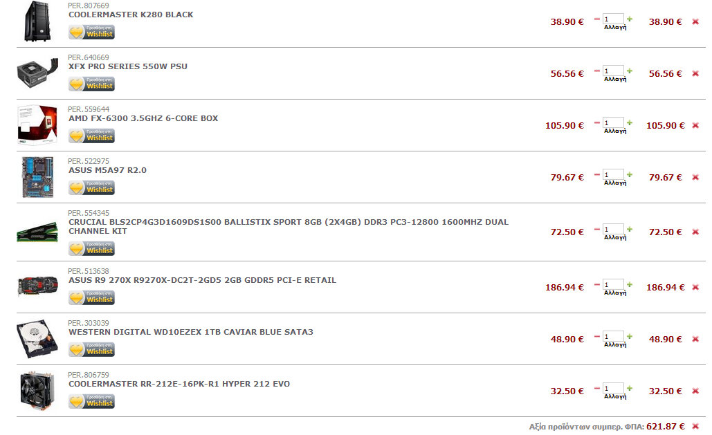 tedgr13 Δημοσ. 6 Ιουλίου 2014 Μέλος Δημοσ. 6 Ιουλίου 2014 Καλησπέρα!Επαναφέρω το θέμα καθώς άλλαξαν τα δεδομένα.Πουλήθηκε το παλιό pc ,και πάω για καινούριο gaming pc στα 600 ευρώ περίπου. Διάβασα όλα τα σχετικά θέματα στο φόρουμ και κατέληξα στην παρακάτω σύνθεση. Αύριο στέλνω παραγγελία, είναι όλα οκ ή να αλλάξω κάτι??(ssd θα αγοραστεί αργότερα)