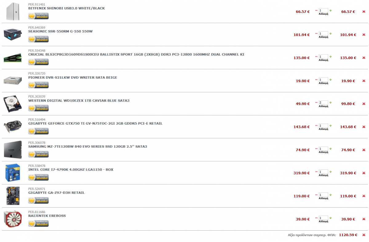 driverpit Δημοσ. 27 Ιουνίου 2014 Δημοσ. 27 Ιουνίου 2014 PER.813053CORSAIR CARBIDE SERIES SPEC-03 MID TOWER CASE WHITE LED 59.90 € PER.640646THERMALTAKE SPS-730MPCBEU SMART SE SERIES 730W CM 87+ PSU 79.90 € PER.558477INTEL CORE I5-4690K 3.50GHZ LGA1150 - BOX 224.90 PER.806759COOLERMASTER RR-212E-16PK-R1 HYPER 212 EVO 32.40 € PER.528713ASROCK Z97 PRO4 RETAIL 114.90 € PER.555886G.SKILL F3-12800CL10D-16GBXL 16GB (2X8GB) DDR3 PC3-12800 1600MHZ RIPJAWSX DUAL CHANNEL KIT 149.00 PER.513638ASUS R9 270X R9270X-DC2T-2GD5 2GB GDDR5 PCI-E RETAIL 186.94 PER.301912SEAGATE ST2000DM001 2TB BARRACUDA 7200.14 SATA3 74.90 € PER.306078SAMSUNG MZ-7TE120BW 840 EVO SERIES SSD 120GB 2.5'' SATA3 74.90 € PER.330703LG GH24NSB0 SUPER MULTI DVD-REWRITER SATA BLACK 15.50 € Αξία προϊόντων συμπερ. ΦΠΑ: 1013.24 € 1