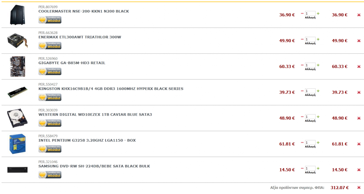 driverpit Δημοσ. 29 Ιουνίου 2014 Δημοσ. 29 Ιουνίου 2014 (επεξεργασμένο) Επίσης μπορεί κάποιος να με βοηθήσει προτείνοντας μου κάποια σύνθεση με i3? AEROCOOL V3X ADVANCE MIDI TOWER BLACK EDITION 32.31 € CORSAIR VS SERIES VS450 - 450W POWER SUPPLY 37.42 € INTEL CORE I3-4150 3.50GHZ LGA1150 - BOX 101.94 € ASROCK H97M PRO4 RETAIL 82.90 € CORSAIR CMX4GX3M1A1600C11 XMS3 4GB DDR3 1600MHZ PC3-12800 40.26 € WESTERN DIGITAL WD10EZEX 1TB CAVIAR BLUE SATA3 48.90 € LG GH24NSB0 SUPER MULTI DVD-REWRITER SATA BLACK 15.50 € Σύνολο: 359.23 € Εάν μπορείς να διαθέσεις και 20 ευρώ επιπλέον για να πάρεις μια ψήκτρα για τον επεξεργαστή κοίτα αυτήν που σου πρότεινε σε παραπάνω μηνύματα του ο pnick http://www.e-shop.gr/raijintek-aidos-p-PER.811684 Επεξ/σία 29 Ιουνίου 2014 από driverpit 1 1
