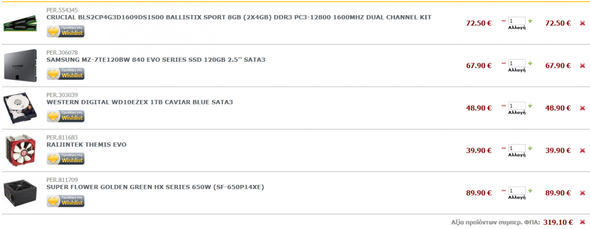 Tb/s Δημοσ. 5 Ιουλίου 2014 Μέλος Δημοσ. 5 Ιουλίου 2014 δεν θα έχεις πρόβλημα όποια και να πάρεις για σκληρό γράψε λάθος τον black ήθελα να βάλω πολυ καλος σκληρος δισκος ισχυει . THERMALTAKE SPS-630MPCBEU SMART SE SERIES 630W CM 87+ PSU 62.46 € KINGSTON KHX18C9T3K2/8X 8GB (2X4GB) DDR3 1866MHZ XMP BEAST SERIES DUAL CHANNEL KIT 83.57 € WESTERN DIGITAL WD10EZEX 1TB CAVIAR BLUE SATA3 48.90 € GIGABYTE GEFORCE GTX750 GV-N750OC-2GI 2GB GDDR5 PCI-E RETAIL 121.99 € COOLERMASTER RR-212E-16PK-R1 HYPER 212 EVO 32.50 € Σύνολο: 349.42 € ευχαριστω για το mode να σαι καλα ːD τα 630w θα με καλυψουν για την χρηση που κανω διοτι επισης σκεφτομαι να μην δωσω τωρα 120 ευρω για μια σχετικα "μετρια" καρτα γραφικων αλλα σε 1-2 χρονια να αγορασω μια με 400 ευρω περιπου Σύνθεση 320€.png Στην θέση σου, εφόσον θα αγοράσεις με δόσεις, θα κοίταζα να αλλάξω και κουτί. Δεν θα κάνεις κάτι αξιόλογο με αυτό το κουτί και θα βρείς μπροστά σου τις δυσκολίες, από το cable management μέχρι τις θερμοκρασίες αύριο-μεθαύριο που θα επιχειρήσεις oc. Βάλε αν θέλεις άλλο ένα 50άρικο στο budget για να μπεί κανά κουτάκι της προκοπής. ευχαριστω πολυ φιλε για την συνθεση ;D το ξερω αυτο με το κουτι αλλα η αγορα ενος full tower ειναι απο 100 ευρω και πανω αλλα θατο προσπαθησω. Επισης πρατηρησα οτι στις συνθεσεις σας εχετε επιλεξει αλλα τροφοδοτικα απο το corsair που ειχα σκοπο να παρω , δεν ειναι τοσο καλο κατα την γνωμη σας ʔ Τροφοδοτικό,ram,ψύκτρα και σκληρό θέλεις να πάρεις; Μιλάς για gaming και προγραμματισμό και θα κρατήσεις την 5770; Πες και τι σκέφτεσαι για οθόνη. Οπως ειπα δυστηχως λογω χρηματων η μονη λυση ειναι ναι να κρατησω την 5770 και να κρατησω λεφτα για μια δυνατη καρτα γυρω στα 3-4 κατοσταρικα. Οσο για οθονη ειναι μια δευτερευουσα αγορα προς το παρων απλα ειπα να ζητησω και μια αποψη μιας και εκανα το ποστ για την χρηση και τα parts του pc που φτιαχνω