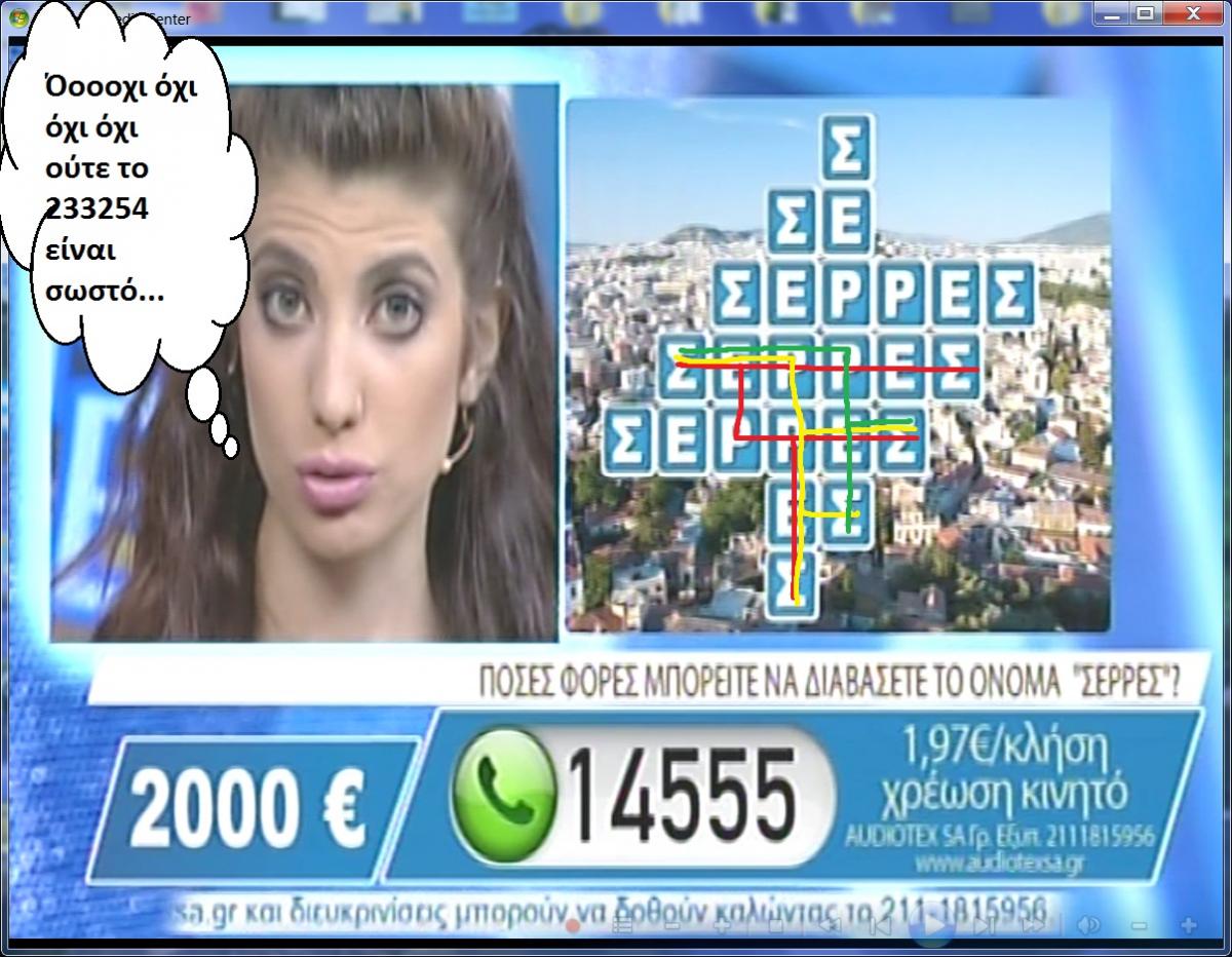 thor777 Δημοσ. 9 Ιουλίου 2014 Δημοσ. 9 Ιουλίου 2014 (επεξεργασμένο) Καταρχήν υπάρχουν 10 Σ οπότε ξεκινώντας απο 1 Σ στην συνέχεια ακολουθεις μια διαδρομή μέχρι να σχηματίσεις την λέξη ΣΕΡΡΕΣ, εννοείται οτι υπάρχουν αρκετές τέτοιες διαδρομές, ενώ μπορείς να κινηθείς οριζόντια και καθετα αλλάζοντας και κατεύθυνση αλλά όχι διαγώνια και φυσικά δεν μπορείς να πηδήξεις ένα γράμμα ή να το χρησιμοποιήσεις 2 φορές κάνοντας κύκλο. Πάντως στην ουσία χρειάζεται να φτάσεις μέχρι το ΣΕΡΡ διότι αν παρατηρήσετε για κάθε ΣΕΡΡ σχηματίζονται 4 ΣΕΡΡΕΣ, δηλαδή το πρόβλημα είναι ισοδύναμο με το πόσα ΣΕΡΡ μπορείς να "διαβάσεις" οπου η απάντηση είναι 40. Π.χ. ξεκινώντας απο το πρώτο Σ μπορείς να σχηματίσεις μόνο 2 διαφορετικά ΣΕΡΡ άρα έχουμε 2*4=8 ΣΕΡΡΕΣ , ξεκινώντας απο το δευτερο Σ μπορείς να σχηματίσεις 6 ΣΕΡΡ άρα έχουμε 6*4 =24 ΣΕΡΡΕΣ και ουτο καθεξής. Οι περιπτώσεις(διαδρομές) ξεκινώντας απο κάθε ένα απο αυτά τα 10 Σ είναι 8,24,28,4,16,16,4,28,24,8 . Αν προσθέσεις αυτούς τους αριθμους βγαίνει 160 Επεξ/σία 9 Ιουλίου 2014 από thor777