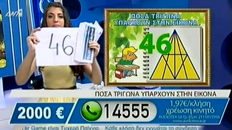 thor777 Δημοσ. 12 Ιουλίου 2014 Δημοσ. 12 Ιουλίου 2014 (επεξεργασμένο) 35 + 2 αν μετράνε τα 2 λευκά και + 1 αν μετράει το τσάτσικο μαυρο στην κορυφη του μεγαλου τριγωνου ΝΟΜΙΖΩ ΒΡΗΚΑ ΤΗΝ ΛΥΣΗ Τα λευκά δεν γίνεται να τα μετράνε γιατί δεν υπάρχει επαφή της κορυφής του τριγώνου με το πλαίσιο αλλά για το μπλέ (ή μαυρο εγώ το βλεπω μπλέ) στην κορυφή είναι πολύ πιθανό οπότε πάμε στα 36 Να σου βρώ άλλα 10 για να πάμε στα 46 ? Απο την φράση "ΠΟΣΑ ΤΡΙΓΩΝΑ ΥΠΑΡΧΟΥΝ ΣΤΗΝ ΕΙΚΟΝΑ" υπάρχουν 10 τρίγωνα: στο εσωτερικο του γράμματος Α και στην επαφή των γραμμάτων Ν,Χ,Κ με την γραμμή υπογράμμισης. Οι άνθρωποι έχουν νοσηρή φαντασία διότι σαν εικόνα θεωρούν οτι υπάρχει μέσα στο κάδρο κάτι το οποίο όμως έπρεπε να το φανταστούμε τουλάχιστον εμείς που έχουμε παρακολουθήσει αρκετές εκπομπές τους. Επεξ/σία 12 Ιουλίου 2014 από thor777