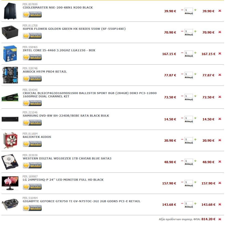 BabisTs Δημοσ. 10 Ιουλίου 2014 Δημοσ. 10 Ιουλίου 2014 PER.558400INTEL CORE I5-4570 3.20GHZ LGA1150 - BOX 175.50 € PER.640669XFX PRO SERIES 550W PSU 63.94 € PER.528681ASROCK H87M PRO4 RETAIL 70.48 € PER.554345CRUCIAL BLS2CP4G3D1609DS1S00 BALLISTIX SPORT 8GB (2X4GB) DDR3 PC3-12800 1600MHZ DUAL CHANNEL KIT 72.50 € PER.321046SAMSUNG DVD-RW SH-224DB/BEBE SATA BLACK BULK 14.50 € PER.345374KINGSTON SV300S37A/60G V300 SSD 60GB SATA3 2.5'' RETAIL 44.99 € PER.303046WESTERN DIGITAL WD7500BPVX BLUE 750GB 2.5'' SATA3 47.90 € PER.170178LG 23MP55HQ-P 23'' AH-IPS LED MONITOR FULL HD 141.90 € PER.811684RAIJINTEK AIDOS 20.90 € PER.513662ASUS RADEON R7 265 R7265-DC2-2GD5 2GB GDDR5 PCI-E RETAIL 158.95 € PER.810872AEROCOOL V3X MIDI TOWER DEVIL RED EDITION BLACK/RED 29.06 € Αξία προϊόντων συμπερ. ΦΠΑ: 840.62 €