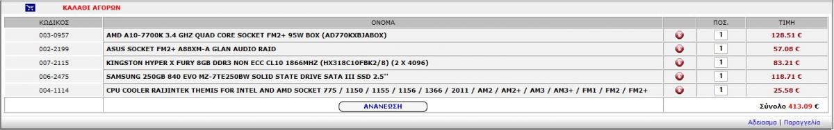 CorsairA7 Δημοσ. 22 Αυγούστου 2014 Δημοσ. 22 Αυγούστου 2014 O κουμπάρος Βασίλης γλυκάθηκε από το σύστημα που παρήγγειλα και θέλει κι αυτός ένα με AMD APU. Eχει ένα midi tower coolermaster και ενα τροφοδοτικό thermaltake 500w και μια 23άρα ips Samsung αγνωστων λοιπων στοιχείων τώρα. Ριχνω τη φόρμα i) Το ποσό που διαθέτουμε:420- το πολυ 480, αυστηρά. ii) Tη χρήση του υπολογιστή (αναφέρετε επίσης αν θα ασχοληθείτε με το mining ή όχι :bf2 και γενικά gaming με τιτλους 5ετίας χωρις απαιτησεις για high settings κτλ, casual πραγματα, ταινίες, office, internetiii) Ειδικά προγράμματα που θα χρησιμοποιηθούν: οχιiv) Στη σύνθεση θέλουμε να συμπεριληφθεί οθόνη? οχι εχει μια 23αρα IPS Samsungv) Στη σύνθεση θέλουμε να συμπεριληφθούν και πληκτρολόγιο,ηχεία,ποντίκι? οχι vi) Το Hardware-περιφερειακά-οθόνη που θέλουμε να αγοράσουμε, θέλουμε να είναι απο ένα κατάστημα (διευκρινίστε ποιο) ή επιθυμούμε την αγορά απο διαφορετικά καταστήματα? από διαφορετικά καταστήματα αν κερδίζουμε σε τιμή. eshop , μην μπλεκει με μεταφορικα απο δω κι απο κει και πληρωσει περιπου τα ιδια στο τελοςvii) Επιθυμούμε να συναρμολογηθεί το σύστημα στο κατάστημα (στην περίπτωση που δεν γνωρίζουμε πως να το συναρμολογήσουμε) ή το σύστημα θα στηθεί απο τον ενδιαφερόμενο?Θα το στήσει ενας συναδερφος του.viii) Επιθυμούμε λειτουργικό σύστημαΟχι Eαν χωρεσει ssd της προκοπής από 180gb και πάνω, θα ηταν τελεια λεει, δε θελει hdd. Για να δούμε! Eπίσης με βάση αυτά που ρωταω για τιμες εγώ εδω http://www.insomnia.gr/topic/501899-%CF%80%CF%8C%CF%83%CE%BF-%CE%BD%CE%B1-%CF%80%CE%BF%CF%85%CE%BB%CE%AE%CF%83%CF%89-%CE%B1%CE%B3%CE%BF%CF%81%CE%AC%CF%83%CF%89-%CE%AD%CE%BD%CE%B1/page-354 , μπορεί να χρησιμοποιηθεί τίποτα στη σύνθεση? Θελει vfm, και με 420 αν μπορούμε, μπορούμε? Ευχαριστω!.