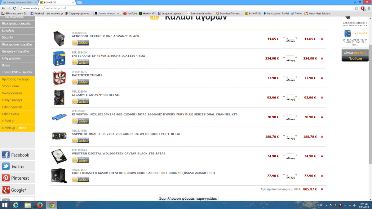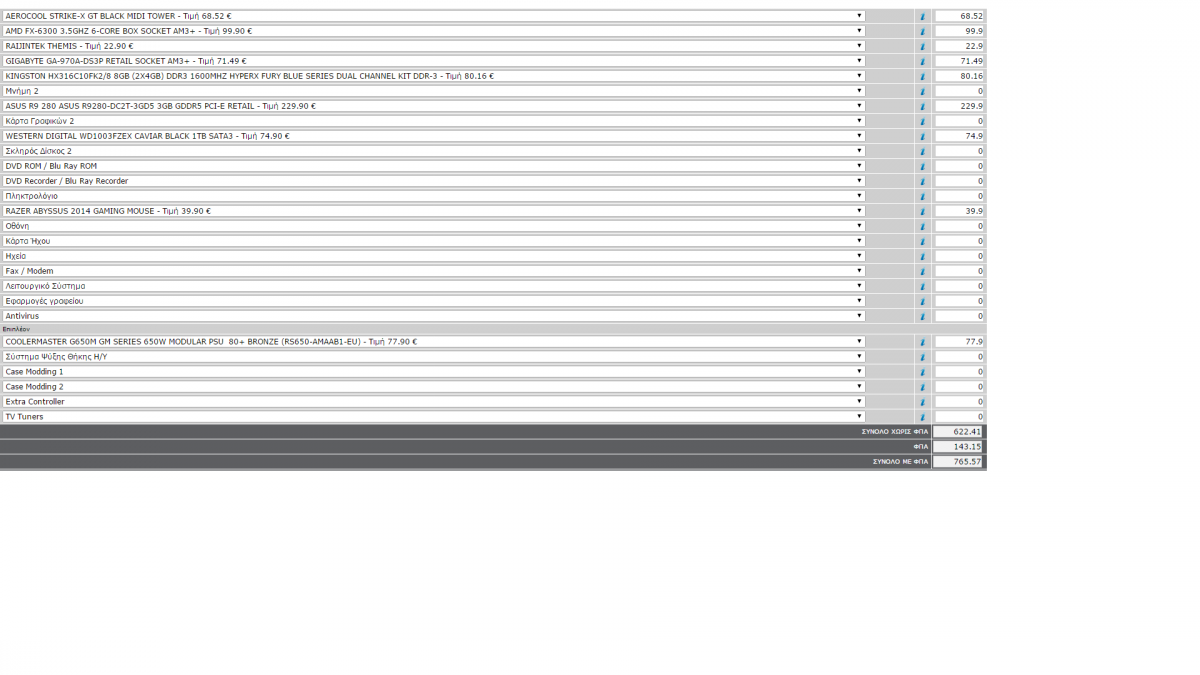 kataramenos32 Δημοσ. 4 Νοεμβρίου 2014 Μέλος Δημοσ. 4 Νοεμβρίου 2014 Λοιπον παιδια εχουμε και λεμε CASE: http://www.e-shop.gr/aerocool-strike-x-one-advance-black-p-PER.809475 (Θελει να ειναι και λιγο καγκουρια γι'αυτο βαζω τετοια) CPU: http://www.e-shop.gr/intel-core-i5-4670k-340ghz-lga1150-box-p-PER.558409 CPU COOLER: RAIJINTEK THEMIS MOBO: http://www.e-shop.gr/gigabyte-ga-z97p-d3-retail-p-PER.526976 RAM: http://www.e-shop.gr/kingston-hx318c10fk2-8-8gb-2x4gb-ddr3-1866mhz-hyperx-fury-blue-series-dual-channel-kit-p-PER.550881 GPU: http://www.e-shop.gr/sapphire-dual-x-r9-270x-2gb-gddr5-oc-with-boost-pci-e-retail-p-PER.514536 HDD: http://www.e-shop.gr/western-digital-wd1003fzex-caviar-black-1tb-sata3-p-PER.303074(Τον ssd τον αφηνουμε προς το παρον) CASE: http://www.e-shop.gr/coolermaster-g650m-gm-series-650w-modular-psu-%C2%96-80-bronze-rs650-amaab1-eu-p-PER.811577 Συνολο βγαινουν 805.97.Εχω αφησει τα περιφερειακα προς το παρον τα οποια θα αγοραστουν αργοτερα.Πιστευω ειναι καλη η συνθεση αλλα αν υπαρχει καμια αλλη προταση πειτε μου.Επισης αν ξερει να μου πει κανεις πως μπορω να δω το κοστος των μεταφορικων