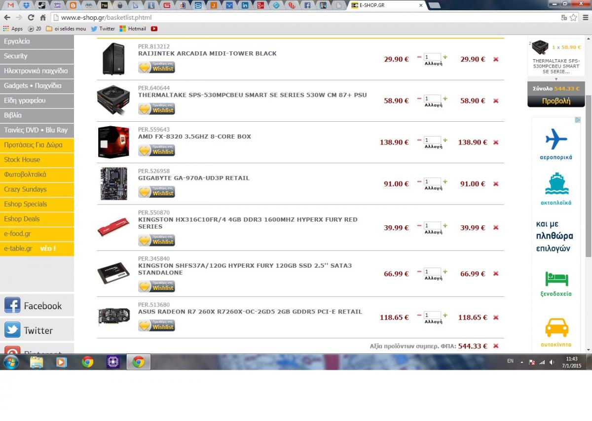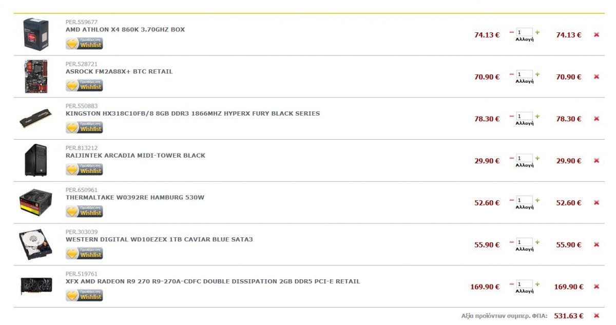 Giorgos65ert Δημοσ. 7 Ιανουαρίου 2015 Δημοσ. 7 Ιανουαρίου 2015 PER.813212 RAIJINTEK ARCADIA MIDI-TOWER BLACK 29.90 € Αλλαγή 29.90 € PER.650961 THERMALTAKE W0392RE HAMBURG 530W 52.60 € Αλλαγή 52.60 € PER.526959 GIGABYTE GA-970A-DS3P RETAIL 69.99 € Αλλαγή 69.99 € PER.559644 AMD FX-6300 3.5GHZ 6-CORE BOX 107.50 € Αλλαγή 107.50 € PER.550874 KINGSTON HX316C10FW/4 4GB DDR3 1600MHZ HYPERX FURY WHITE SERIES 40.74 € Αλλαγή 40.74 € PER.519761 XFX AMD RADEON R9 270 R9-270A-CDFC DOUBLE DISSIPATION 2GB DDR5 PCI-E RETAIL 169.90 € Αλλαγή 169.90 € PER.345373 KINGSTON SV300S37A/120G V300 SSD 120GB SATA3 2.5'' RETAIL 58.85 € Αλλαγή 58.85 € Αξία προϊόντων συμπερ. ΦΠΑ: 529.48 € ένα 30αρι πάνω άλλα πιστεύω αξίζει. 1)στο μέλλον να ΠΡΟΣΤΕΘΕΙ άλλη μια 4αρα μνήμη.(άλλα και τα 4 είναι ότι πρέπει για CSGO και LOL) άμα δεν μπορείς να δόσεις αυτά τα extra χρήματα πάνε σε 260x είναι ότι πρέπει για CSGO-LOL