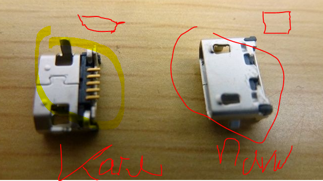 smoke0man2 Δημοσ. 6 Ιουνίου 2015 Μέλος Δημοσ. 6 Ιουνίου 2015 Άμα απλά ξεκόλλησε δεν έχεις θέμα, βάζεις και το ίδιο και βάζεις και κόλλα για να πιάσει, μετά κάνεις τις ενώσεις. Αν όμως έχει σπάσει μέσα (έτσι πχ) τότε όντως θες άλλο. Δηλαδή, φορτιστής micro usb μπαίνει στην θύρα; Αν μετρήσεις με πολύμετρο στα πόδια gnd και 5v (πρώτο και τελευταίο πόδι) σου δίνουν 5v όσο έχεις τον φορτιστή συνδεδεμένο? Απάνω στην πλακέτα φαίνεται που κατέληγαν το πρώτο και το τελευταίο πόδι απο τα 5; Γιατί εκεί πρέπει να τα τερματίσεις με κανένα καλώδιο. στη φωτο το μαυρο κυκλωμενο τα 5πινακια φαινονται ανεπαφα το κοκκινο θα πρεπει να τα βγαλω την περιτη κολληση?//(επισης τη ρολο παιζουν ?στηριγματα? και το μπλε πρεπει να το βγαλω ?(επισης τη ρολο παιζουν ?στηριγματα? ευχαριστω παιδια για τη βοηθεια τελικα θα παραγγειλω ανταλακτικο γιατι αυτο μεν μπάινει ο φορτιστης αλλα δεν δειχνει 5 βολτ οπως μου ειπες οποτε πιο προτεινεται να παρΩ? εχω δει 1. http://www.ebay.com/itm/10-X-Micro-USB-Data-Sync-Charge-Charger-Charging-Port-Connector-Replacement-Jack-/160680396370?ssPageName=ADME:X:AAQ:US:1123 2.http://www.ebay.com/itm/2x-lenovo-ideatab-a3000-Tablet-Micro-USB-Charger-Charging-Port-Dock-Connector-US-/371189273318?ssPageName=ADME:X:AAQ:US:1123ποιο προτεινεται