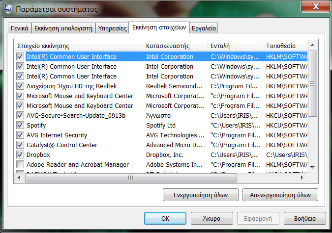 Επισκέπτης Δημοσ. 22 Αυγούστου 2015 Δημοσ. 22 Αυγούστου 2015 Έχω Windows 7 x64 και ορισμένες φορές όταν το ανοίγω, αφού γίνει η εκκίνηση των Windows, κάνει boot σε μαύρη οθόνη. Άλλες φορές με ποντίκι, άλλες φορές χωρίς το ποντίκι. Ctrl+Alt+Del και Ctrl+Shift+Esc δεν δουλεύουν. Σκέφτηκα μήπως φταίει κάποιο απ'τα startup items. Αυτά είναι που μου εμφανίζονται. Γτ κάποια βγαίνουν δίπλα και τριπλά; Μήπως φταίει αυτό; Τι είναι ασφαλές να απενεργοποιήσω; Να αναφέρω επίσης ότι έχω ένα σκληρό δίσκο 500GB από τα οποία είναι ελεύθερα τα 26GB, αλλά παλαιότερα είχε ελεύθερα κάπου στα 10GB. Πρόσφατα απεγκατέστησα κάποια προγράμματα που δεν χρησιμοποιούσα πλέον (κυρίως παιχνίδια) και διέγραψα κάποια αρχεία για να απελευθερώσω χώρο. Ενώ παλιά ήταν πιο φορτωμένο, δεν μου δημιουργούσε τέτοιο πρόβλημα. Τι μπορώ να κάνω;