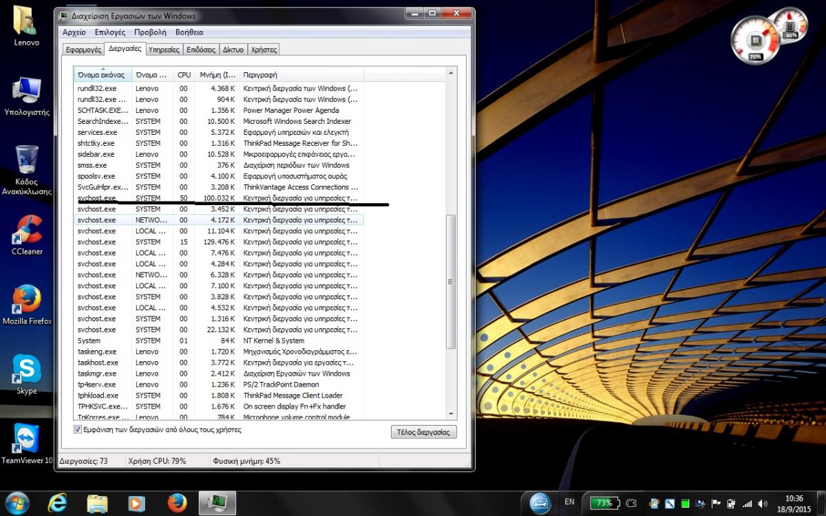 astrea966 Δημοσ. 18 Σεπτεμβρίου 2015 Δημοσ. 18 Σεπτεμβρίου 2015 καλημερα.μετα απο φρεσκια εγκατασταση windows 7 σε λαπτοπ thinkpad Χ200 εχω παρατηρησει οτι μια διεργασια συστηματος καταναλωνει το 50% της ισχυος του επεξεργαστη σε μονιμη βαση.οπως θα δειτε και στη φωτο.οσο και αν το αφησω δεν πεφτει αλλα αντιθετως τραβαει και περισσοτερη μνημη και φτανει στο 1gb.αν της κανω τερματισμο κλεινει για κανενα λεπτο και μετα ξαναξεκιναει και εχουμε παλι τα ιδια.πως μπορω να δω τι ειναι αυτο που απασχολει τον επεξεργαστη?η εγκατασταση ειναι 3 ημερων.