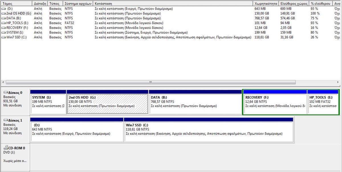 funbreaker Δημοσ. 7 Οκτωβρίου 2015 Δημοσ. 7 Οκτωβρίου 2015 Ο σκοπός: Είχα στο laptop HP G72 120ev τον Crucial M500 120GB SSD και επειδή αγόρασα τον SanDisk Ultra Plus 128GB είπα να τον αντικαταστήσω και τον παλιό να τον βάλω σε ένα Netbook MSI Wind U100 plus με SATA I. Το Laptop & οι δίσκοι: Το laptop έχει μια θήκη για τον σκληρό όπου έχω έναν HDD Western Digital Scorpio Blue 1TBμε 3-4 partitions (δες εικόνα) ένα εκ των οποίων έχει το λειτουργικό που υπήρχε πριν βάλω τον πρώτο SSD. Όμως δεν έκανα boot ποτέ από εκεί, απλά το άφηνα να υπάρχει. (Σημειώνω πως ήταν το ίδιο λειτουργικό και στους δύο δίσκους γιατί και τότε clone είχα κανει. Το λειτουργικόι είναι windows 7 Prof) Το laptop έχει επίσης ένα Disk Candy που μπαίνει στην θέση του DVD Drive και εκεί βάζω τον εκάστοτε SSD που έχει το σύστημα γιατί ο HDD δεν χωράει για 0,5mm στο candy. Παρόλα αυτά δεν υπάρχει διαφορά στην ταχύτητα όπου κι αν έβαλα τον SSD. Το Clone: Για να κάνω το clone λοιπόν έβγαλα τον HDD από την θήκη του δίσκου και έβαλα τον νέο SSD και έκανα clone από τον παλιό SSD που ήταν στο Candy με το Acronis True Image Home. Η πρώτη εκκίνηση: Μετά έβγαλα τον παλιό SSD από το Candy και έβαλα τον νέο και έκανα την πρώτη εκκίνηση χωρίς ακόμα να έχω βάλει τον HDD στην θήκη του δίσκου. Η εκκίνηση στέφθηκε από απόλυτη επιτυχία και χάρηκα που ξεμπέρδεψα γρήγορα. Το πρόβλημα: Μετά έβαλα τον HDD και τότε ξεκίνησε το πρόβλημα:Μόλις ξαναέκανα εκκίνηση μου έβγαλε μια μπλε οθόνη.Έβαλα λοιπόν ένα cd επιδιόρθωσης που είχα και δεν θυμάμαι τι ακριβώς είναι, έκανε ότι έκανε και τελικα κατέληξα να μου βγάζει κατά την εκκίνηση μια οθόνη επιλογής λειτουργικού.Επειδή δεν ήθελα να μου την βγάζει μπήκα από το λειτουργικό του νέου SSD και πήγα και έκανα format το partition του HDD με το παλιό λειτουργικό. Πίστευα πως έτσι θα σταματούσε να βγάζει την οθόνη επιλογής και πως θα με έβαζε κατευθείαν στον SSD.Όμως δεν το κάνει.Πώς μπορώ να διορθώσω το πρόβλημα? Παραθέτω και μια εικόνα απ την διαχείρηση δίσκων: