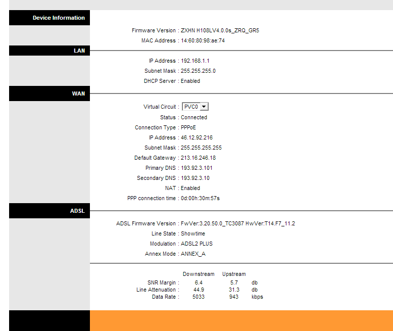 FunnyCause Δημοσ. 19 Οκτωβρίου 2015 Δημοσ. 19 Οκτωβρίου 2015 Καλησπερα στα μελη. Προχθες ηρθα για επισκεψη σε εναν ξαδερφο μου στον ευοσμο και αφου συνδεθηκα στο ιντερνετ παρατηρησα πολλυυυυυ χαμηλες ταχυτητες.(συνδεση 24αρα, η συνδεση στα 2.5 ηταν ουσιαστικα και κατεβαζα με 200kb/s) Ετσι αποφασισα σημερα να παρω τηλεφωνο στην εξυπηρετηση πελατων να δω τι παιζει και μου ειπαν οντως το ιντερνετ ηταν αργο και αφου εκανε καποιες ρυθμισεις(το snr αλλαξε ουσιαστικα) μου ειπε οτι εφτανα στα 5. Μου ειπαν επισης οτι απο 4-8 φτανει η ταχυτητα στην περιοχη. Πλεον, το κατεβασμα κατεβηκε στα 80kb/s και ουσιαστικα δεν αλλαξε τιποτα μετα απο το τηλεφωνημα. Τα στοιχεια του ρουτερ zte zxhn h180l τα παραθετω παρακατω. Πως μπορω να διορθωσω την κατασταση;