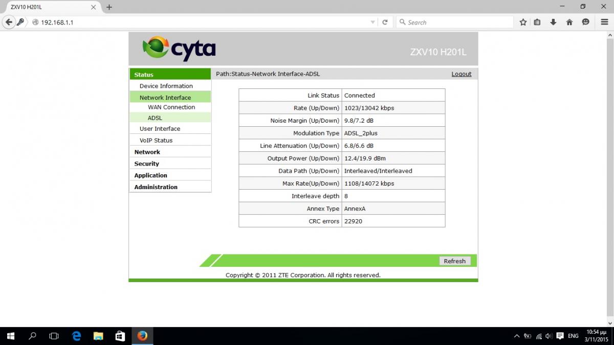 tha84 Δημοσ. 4 Νοεμβρίου 2015 Δημοσ. 4 Νοεμβρίου 2015 Καλησπέρα, Εδώ και λίγο καιρό έχω σύνδεση Cyta εως 24 Mbps. Συγχρονίζει στα 12. Απο τα στατιστικά της γραμμής μου πιστεύω οτι θα έπρεπε να είναι λίγο παραπάνω. Το μόντεμ που έχω είναι το ZXV10 H201L της ZTE το οποίο έχει τα θεματάκια με τις ασύρματες συσκευές μου αλλά και γενικότερα. Μπορώ να το αλλάξω με κάποιο άλλο (που να έχει και voip και να το υποστηρίζει η Cyta) ? Έχω κάνει διάφορες δοκιμές (φιλτράκια, συσκευές τηλεφώνου,καμία συσκευή εκτός το μόντεμ κτλ) και με το παλιό thomson tg585 v7 (χωρίς τηλεφωνία) αλλά πάλι εκεί συγχρονίζω. Η πολυκατοικία είναι σχετικά καινούρια και η εγκατάσταση καθαρή και στον πίνακα και στο διαμέρισμα (έρχεται καλώδιο ethernet και μόνο 1 ζευγάρι χρησιμοποιείται, λόγω voip χρησιμοποιώ ένα πριζάκι μόνο, το πρώτο της εγκατάστασης και πάνω στο μόντεμ το τηλέφωνο, ούτε συναγερμοί ούτε κάτι άλλο). Έχει έρθει τεχνικός της Cyta και τα βρήκε όλα πολύ ωραία. Με line attenuation 11 db δεν θα έπρεπε να είμαι λίγο παραπάνω ? Το gap το διορθώνει η Cyta ? Τι πρέπει να ζητήσω και που να απευθυνθώ? Παραθέτω εικόνες απο τα 2 μόντεμ και με Orbmt στο Thomson. Ευχαριστώ.