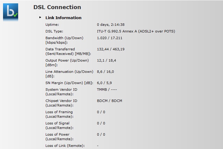 partblah1990 Δημοσ. 27 Νοεμβρίου 2015 Δημοσ. 27 Νοεμβρίου 2015 Μπορει κανεις να μου πει αν η συνδεση μου ειναι καλη ; Γιατι που και που το ρουτερ αποσυγχρονιζει . Link Information DSL Type: ADSL2+ Current Bandwidth (Up/Down) [kbps/kbps]: 1020 / 8878 Max Bandwidth (Up/Down) [kbps/kbps]: 1068 / 10244 Data Transferred (Sent/Received) [b/B]: 90123203 / 92618602 Output Power (Up/Down) [dBm]: 11.5 / 16.5 Line Attenuation (Up/Down) [dB]: 7.5 / 17.5 SN Margin (Up/Down) [dB]: 8.1 / 8.4 Loss of Framing (Local/Remote): 0 / 0 Loss of Signal (Local/Remote): 0 / 0 FEC (Up/Down): 0 / 3593 CRC (Up/Down): 196608 / 8