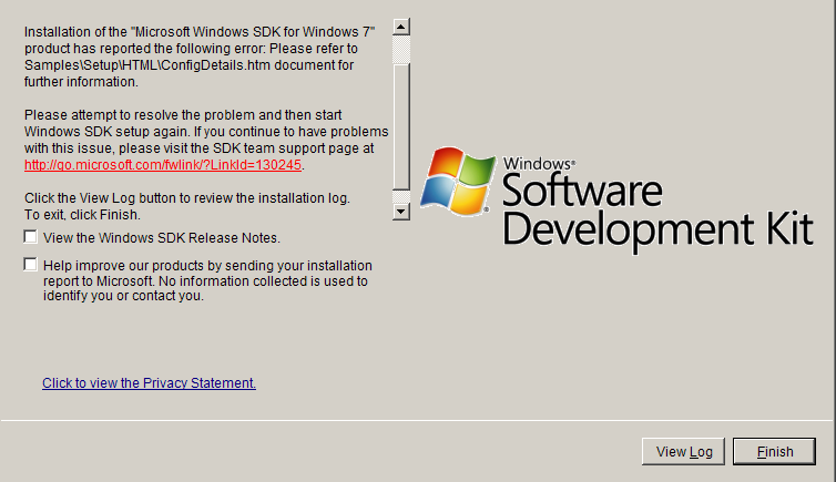 slevinkelevra Δημοσ. 20 Δεκεμβρίου 2015 Δημοσ. 20 Δεκεμβρίου 2015 Καλησπερα Θελω να εγκαταστησω windows SDK σε windows 7 laptop. Παω Site: εδω και κλικαρω Download, μου κατεβαζει αρχειο winsdk_web.exe, το κλικαρω , τρεχει και ολα καλα. Και στο τελευταιο βημα μου λεει Installation failed, οπως στην εικονα που εχω επισυναψει. Κανω copy/paste στο Link γιατι για καποιο λογο δεν κλικαρεται και με βγαζει Site: εδω . Ψαχνω αλλα αρχειο SDKSetupLog.txt δεν βρισκω. Επισης στη διαδρομη C:\Program Files (x86)\Microsoft SDKs\Windows\v7.1A υπαρχει ενα SDK αλλα δεν ξερω αν ηταν εκει πριν η μετα το αποτυχημενο installation γιατι το λαπτοπ δεν ειναι δικο μου και σαν μαγος που ειμαι, δε σκεφτηκα να κοιταξω απο πριν. Οποτε, πως το φτιαχνω αυτο για να γινει κανονικο Install ? Ευχαριστω πολυ
