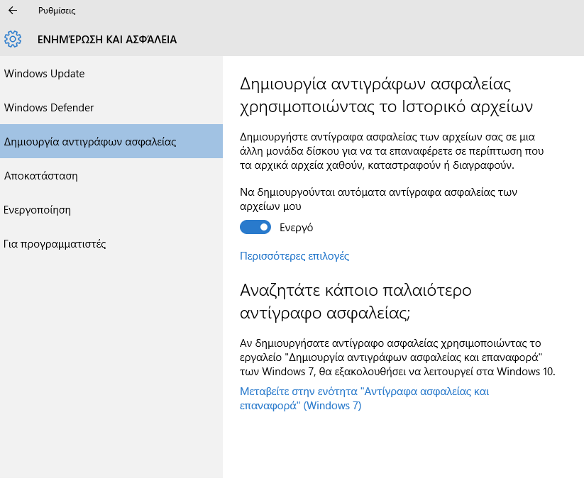ntg1980 Δημοσ. 20 Ιανουαρίου 2016 Δημοσ. 20 Ιανουαρίου 2016 Ερώτηση (λίγο μπερδεμένη):Στα Windows 10 υπάρχει η επιλογήΔημιουργία αντιγράφων ασφαλείας χρησιμοποιώντας το Ιστορικό αρχείωναπό κάτω όμως υπάρχει ακόμα μία επιλογήΜεταβείτε στην ενότητα "Αντίγραφα ασφαλείας και επαναφορά" (Windows 7)όπου αν κάνω κλικ, με πετάει στο κλασικό παράθυρο ρυθμίσεων που γνωρίζουμε απ'τα 7άρια.(Έχω επισυνάψει εικόνες απ'το PC μου)1. Ποια η διαφορά μεταξύ τους? Διότι το πρώτο μου εμφανίζει ότι είναι ενεργοποιημένο(εγώ το ενεργοποίησα να δημιουργεί αντίγραφα ασφαλείας σε έναν εξωτερικό σκληρό),ενώ το άλλο όχι.2. Δημιουργεί το πρώτο Αντίγραφα ασφαλείας ειδώλου συστήματος(σε περίπτωση που κολλήσουν τα Windows)ή απλώς δημιουργεί μόνο αντίγραφα αρχείων?3. Και (τέλος) έχω έναν εξωτερικό δίσκο WD που τον έχω ρυθμίσει να κάνει Back up τα αρχεία μου μέσα από το δικό του πρόγραμμα. Να διατηρήσω αυτή τη ρύθμιση (στον WD), να χρησιμοποιώ μόνο την δημιουργία αντιγράφων ασφαλείας των Windows 10 ή και τα δύο? Διότι αν και τα δύο δημιουργούν ακριβώς τα ίδια αντίγραφα στον ίδιο σκληρό, μία απ'τις δύο αυτόματες ρυθμίσεις θα'ταν καλά να απενεργοποιηθεί (φαντάζομαι...).