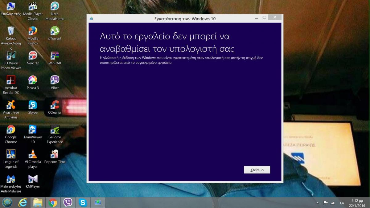 stefant24 Δημοσ. 22 Ιανουαρίου 2016 Μέλος Δημοσ. 22 Ιανουαρίου 2016 Ακριβώς πάνω από'δω που απαντάς, έχει ένα εικονίδιο με μια εικόνα πάνω. Αν κάνεις κλικ εκεί πάνω, μπορείς να ανεβάσεις φωτογραφίες στην απάντηση Οκ το βρήκα . Τα είδες? Απ'αυτό που βλέπω (χωρίς να'μαι βέβαιος - επειδή δεν το'χω μπροστά μου), "κατέβασε" το ISO των Windows 10 και δεν προχώρησε στην αναβάθμιση μέσω update. Μάλλον κατέβασε άλλη έκδοση που δεν είναι αντίστοιχη σε αυτή των 8 που ήδη έχει (αν είχε Windows 8 Home και κατέβασε Windows 10 Pro δεν μπορεί να κάνει αναβάθμιση) ή κατέβασε τα Windows 10 σε διαφορετική γλώσσα, από αυτήν που είχαν τα Windows 8. Οπότε κοιτάμε αυτό. Έμεις τι μπορούμε να κάνουμε τώρα ?