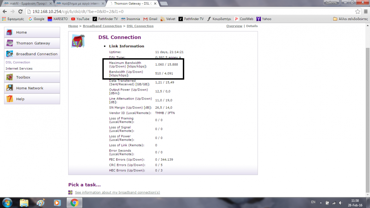 Το πιο πιθανο ειναι να εχει καποιο προβλημα η γραμμη σου αφου βλεπω οτι εχεις 510 στο upload. Ανεβασε και τα υπολοιπα στατιστικα της γραμμης σου(πατησε πανω δεξια στο details οπως φαινεται στην φωτο του thomson που ανεβασες)