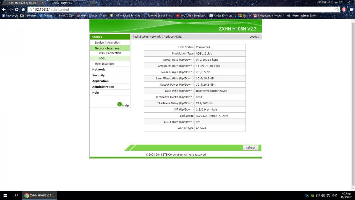 skiabox Δημοσ. 30 Μαρτίου 2016 Δημοσ. 30 Μαρτίου 2016 Μόλις έβαλα και εγώ το συγκεκριμένο modem router και μου δίνει τα παρακάτω στατιστικά. Θεωρώ ότι έχω δει βελτίωση σε σχέση με παλιότερα. Κλείδωνα στα 12.5 mbps adsl , μετά πήγα σε vdsl και έχανα πακέτα (οπότε είχα παγώματα σε online games) επειδή η απόσταση που έχω από το κέντρο είναι 1100 μέτρα και όχι 950 που έδειχνε ο wizard, και τώρα ξαναγύρισα σε adsl και στο 1ο online game που έπαιξα δεν είχε ούτε ένα packet loss. Επίσης όπως βλέπετε κλειδώνω στα 15mbps τώρα, πιο πάνω δηλαδή από ότι με το παλιό adb modem router που είχα. PS : Επίτηδες έψαξα τα post που έχω κάνει στο Insomnia και βρήκα ότι το προηγούμενο Attenuation στον ίδιο ISP (Cyta) ήταν 21.8. Αυτές οι αλλαγές πως προκύπτουν; Επίσης σύμφωνα με αυτό το άρθρο (http://googlareto.gr/273/) θα έπρεπε να πιάνω 23 mbit ? Και ένα speedtest :