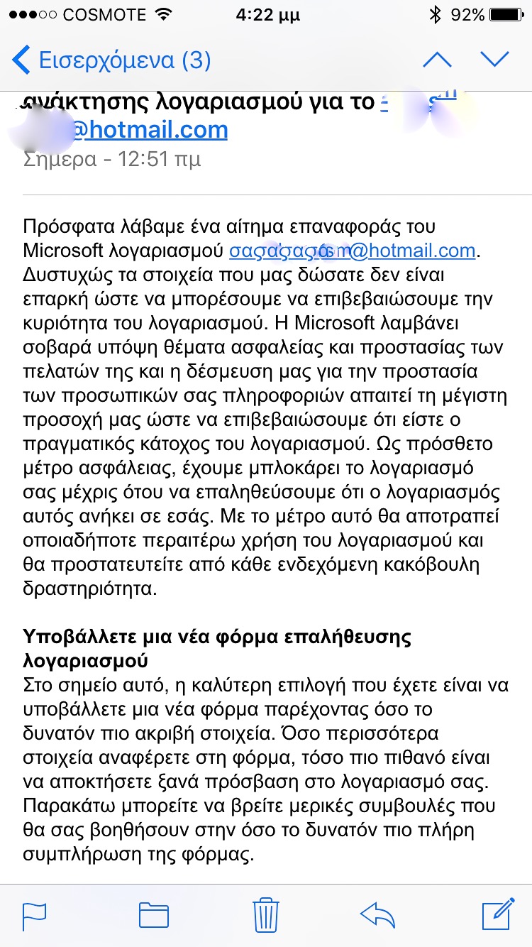 starnik1 Δημοσ. 1 Απριλίου 2016 Δημοσ. 1 Απριλίου 2016 γεια σε ολους.απο χθες δε μπορω να συνδεθω στο email μου(hotmail).μου εμφανιζει μηνυμα οτι καποιος χρησιμοποιει το λογαριασμο μου..πηγαινω να κανω ανακτηση,αλαζω τον κωδικο αλλα παλι καθως πηγαινω να συνδεθω με τον νεο κωδικο πλεον παλι μου εμφανιζει το ιδιο μηνυμα..επισης μεα απο υποβολη αιτησης για επαναφορα του λογαριαμου μου μου ηρθε απαντηση οτι δεν εγινε δεκτο..αυτο ειναι το κυριο mail μου και δε θελω να διαγραφει..παρακαλω οποιος ξερει κατι ας με βοηθησει..