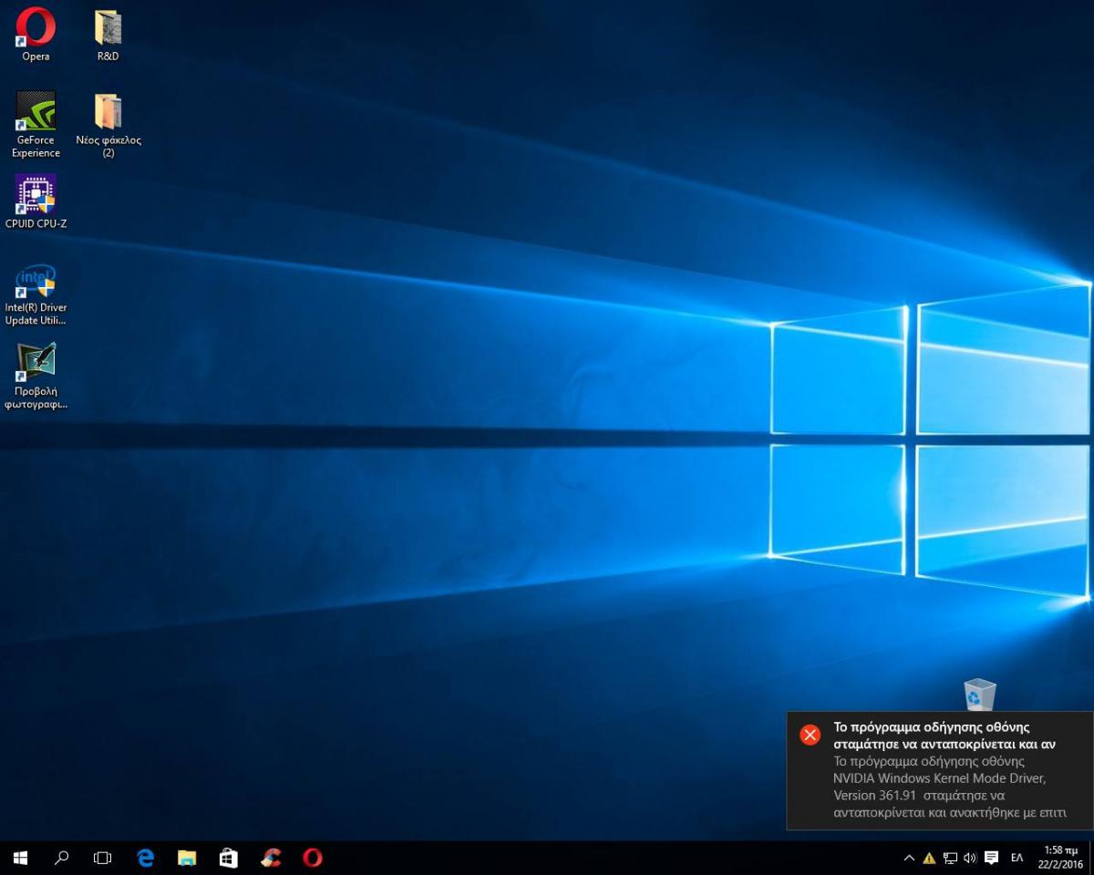 flogerakos Δημοσ. 13 Απριλίου 2016 Δημοσ. 13 Απριλίου 2016 Γεια σας παιδιά! Μετα από καθαρή εγκατάσταση Windows 10 σε desktop pc με GTX 650Ti εμφανίζεται συχνά το παρακάτω μήνυμα και το pc παγώνει.... Έχουν ενημερωθεί τα πάντα, το λειτουργικό με τα τελευταία updates, ολοι οι τελευταίοι drives σε ολες τις συσκευές, έτρεξα το driver sweeper και έδιωξα όλους τους drivers της Nvidia και πέρασα τους τελευταίους αλλά τίποτα.... Καμία ιδέα???