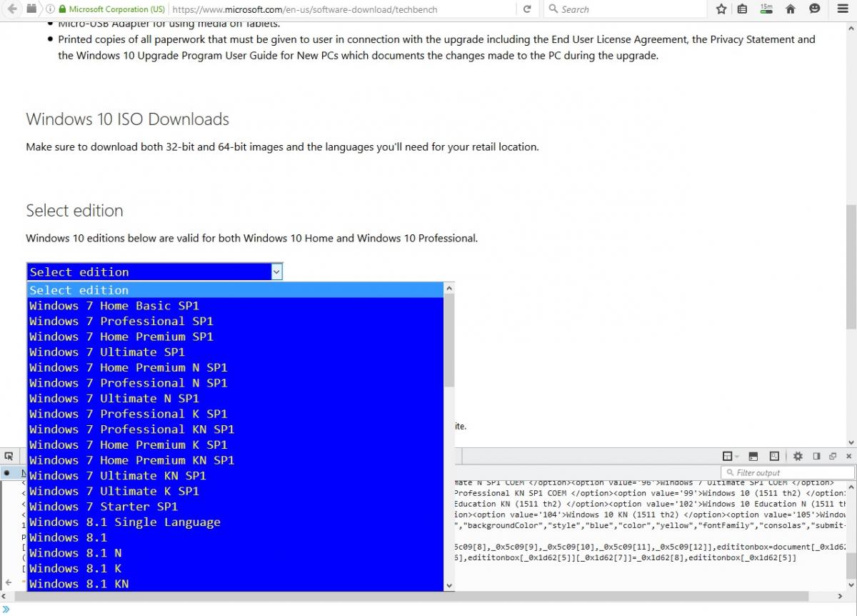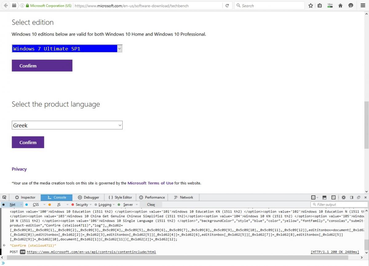 bromiaris Δημοσ. 26 Μαΐου 2016 Δημοσ. 26 Μαΐου 2016 Μπορείς να κατεβασεις οποιοδήποτε ISO οποιασδήποτε γλώσσας/έκδοσης/αρχιτεκτονικής των windows απο Vista και μετα (7-8.1-10) με Direct Download Links απο την Microsoft αρκεί να χρησιμοποιήσεις ενα μικρο hack script Τα βήματα που θα χρειαστει να κανεις είναι τα παρακατω: 1. Πήγαινε στο https://www.microsof...nload/techbench 2. α) Αν χρησιμοποιεις chrome πατα Ctrl + Shift + J β) Αν χρησιμοποιεις Firefox, πατα Ctrl + Shift + K (ισως χρειαστει Allow Pasting πριν την επεξεργασια) 3. Κανε αντιγραφη/επικόληση το παρακατω JavaScript και πατησε enter var _0x5c09=["product-edition","getElementById","innerHTML","<option value=' selected='selected'>Select edition</option><option value='2'>Windows 7 Home Basic SP1 </option><option value='4'>Windows 7 Professional SP1 </option><option value='6'>Windows 7 Home Premium SP1 </option><option value='8'>Windows 7 Ultimate SP1 </option><option value='10'>Windows 7 Home Premium N SP1 </option><option value='12'>Windows 7 Professional N SP1 </option><option value='14'>Windows 7 Ultimate N SP1 </option><option value='16'>Windows 7 Professional K SP1 </option><option value='18'>Windows 7 Professional KN SP1 </option><option value='20'>Windows 7 Home Premium K SP1 </option><option value='22'>Windows 7 Home Premium KN SP1 </option><option value='24'>Windows 7 Ultimate KN SP1 </option><option value='26'>Windows 7 Ultimate K SP1 </option><option value='28'>Windows 7 Starter SP1 </option><option value='48'>Windows 8.1 Single Language </option><option value='52'>Windows 8.1 </option><option value='55'>Windows 8.1 N </option><option value='61'>Windows 8.1 K </option><option value='62'>Windows 8.1 KN </option><option value='68'>Windows 8.1 Professional LE </option><option value='69'>Windows 8.1 Professional LE K </option><option value='70'>Windows 8.1 Professional LE KN </option><option value='71'>Windows 8.1 Professional LE N </option><option value='75'>Windows 10 Education (Academic) th1</option><option value='76'>Windows 10 Education KN (Academic) th1</option><option value='77'>Windows 10 Education N (Academic) th1</option><option value='78'>Windows 10 China Get Genuine Chinese Simplified th1</option><option value='79'>Windows 10 th1</option><option value='80'>Windows 10 KN th1</option><option value='81'>Windows 10 N th1</option><option value='82'>Windows 10 Single Language th1</option><option value='83'>Windows 7 Home Basic SP1 COEM </option><option value='85'>Windows 7 Home Basic SP1 COEM GGK </option><option value='86'>Windows 7 Home Premium N SP1 COEM </option><option value='87'>Windows 7 Home Premium SP1 COEM </option><option value='88'>Windows 7 Home Premium SP1 COEM GGK </option><option value='89'>Windows 7 Home Premium K SP1 COEM </option><option value='90'>Windows 7 Professional N SP1 COEM </option><option value='91'>Windows 7 Professional SP1 COEM </option><option value='92'>Windows 7 Starter SP1 COEM </option><option value='93'>Windows 7 Ultimate K SP1 COEM </option><option value='94'>Windows 7 Ultimate KN SP1 COEM </option><option value='95'>Windows 7 Ultimate N SP1 COEM </option><option value='96'>Windows 7 Ultimate SP1 COEM </option><option value='97'>Windows 7 Home Premium KN SP1 COEM </option><option value='98'>Windows 7 Professional KN SP1 COEM </option><option value='99'>Windows 10 (1511 th2) </option><option value='100'>Windows 10 Education (1511 th2) </option><option value='101'>Windows 10 Education KN (1511 th2) </option><option value='102'>Windows 10 Education N (1511 th2) </option><option value='103'>Windows 10 China Get Genuine Chinese Simplified (1511 th2)</option><option value='104'>Windows 10 KN (1511 th2) </option><option value='105'>Windows 10 N (1511 th2) </option><option value='106'>Windows 10 Single Language (1511 th2) </option>","backgroundColor","style","blue","color","yellow","fontFamily","consolas","submit-product-edition","Confirm (stelios4711)","log],_0x1d62=[_0x5c09[0],_0x5c09[1],_0x5c09[2],_0x5c09[3],_0x5c09[4],_0x5c09[5],_0x5c09[6],_0x5c09[7],_0x5c09[8],_0x5c09[9],_0x5c09[10],_0x5c09[11],_0x5c09[12]],edititonbox=document[_0x1d62[1]](_0x1d62[0]);edititonbox[_0x1d62[2]]=_0x1d62[3],edititonbox[_0x1d62[5]][_0x1d62[4]]=_0x1d62[6],edititonbox[_0x1d62[5]][_0x1d62[7]]=_0x1d62[8],edititonbox[_0x1d62[5]][_0x1d62[9]]=_0x1d62[10],document[_0x1d62[1]](_0x1d62[11])[_0x1d62[2]]=_0x1d62[12]; 4. Τωρα μπορεις πλεον να διαλεξεις οποιοδήποτε ISO Οι επιλογες απο τα διαθεσιμα ISO ειναι οι παρακατω: Windows 7 Home Basic SP1 Windows 7 Professional SP1 Windows 7 Home Premium SP1 Windows 7 Ultimate SP1 Windows 7 Home Premium N SP1 Windows 7 Professional N SP1 Windows 7 Ultimate N SP1 Windows 7 Professional K SP1 Windows 7 Professional KN SP1 Windows 7 Home Premium K SP1 Windows 7 Home Premium KN SP1 Windows 7 Ultimate KN SP1 Windows 7 Ultimate K SP1 Windows 7 Starter SP1 Windows 8.1 Single Language Windows 8.1 Windows 8.1 N Windows 8.1 K Windows 8.1 KN Windows 8.1 Professional LE (With Update 1) Windows 8.1 Professional LE (With Update 1) K Windows 8.1 Professional LE (With Update 1) KN Windows 8.1 Professional LE (With Update 1) N Windows 10 Education (Academic) TH1 (RTM Build 10240) Windows 10 Education KN (Academic) TH1 (RTM Build 10240) Windows 10 Education N (Academic) TH1 (RTM Build 10240) Windows 10 China Get Genuine Chinese Simplified TH1 (RTM Build 10240) Windows 10 TH1 (RTM Build 10240) Windows 10 KN TH1 (RTM Build 10240) Windows 10 N TH1 (RTM Build 10240) Windows 10 Single Language TH1 (RTM Build 10240) Windows 7 Home Basic SP1 COEM Windows 7 Home Basic SP1 COEM GGK Windows 7 Home Premium N SP1 COEM Windows 7 Home