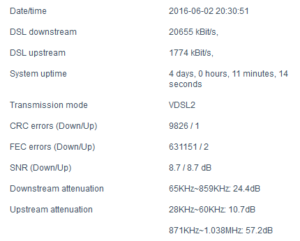 Kate10 Δημοσ. 16 Ιουνίου 2016 Μέλος Δημοσ. 16 Ιουνίου 2016 Καλημέρα! Ξαναήρθαν από ΟΤΕ και μου είπαν ότι είχαν συνδέσει λάθος τα καλώδια. Τελικά τα επανέφεραν και στο status του ρουτερ εμφανίζει τα εξής: DSL Link Information Link Status Up Modulation Type ADSL_2plus Actual Rate(Up/Down) 669/8869 kbps Attainable Rate(Up/Down) 676/9236 kbps Noise Margin(Up/Down) 10.2/9.6 dB Line Attenuation(Up/Down) 8.5/15 dB Output Power(Up/Down) 12.4/18.8 dBm Data Path(Up/Down) Interleaved/Interleaved Interleave Depth(Up/Down) 4/64 Interleave Delay(Up/Down) 11/14 ms INP(Up/Down) 1/1 symbols Profile N/A LinkEncap G.992.3_Annex_K_ATM CRC Errors(Up/Down) 0/4 FEC Errors(Up/Down) 0/372