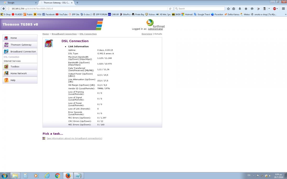 Moderators Inuyasha Δημοσ. 29 Ιουλίου 2016 Moderators Δημοσ. 29 Ιουλίου 2016 Επισης προχτες που τους πηρα τηλεφωνο για να τους αναφερω οτι καθε 5 μερες περιπου ισως κ νωριτερα πεφτει η ταχ. του download εκανε αυτος της φορθνετ κατι τεστ κ ενω με διαβεβαιωσε οτι δεν πειραξε τπτ στην γραμμη μονο οτι την επανεκκινησε, απο τοτε το ρουτερ συγχρονιζει χαμηλοτερα.... υπαρχει περιπτωση να εχουν μεινει ρυθμισεις στην γραμμη μου απο τοτε που ειχα το πιο σοβαρο προβλημα πριν αλλαξει ο οτε την γραμμη η στην επανεκκινηση παει στο defaultΑν τους είπες ότι έχεις αποσυνδεσεις μάλλον ανέβασαν το snr συνήθως η forthnet δίνει 6 στην εικόνα πάνω βλέπω είσαι με 8, πάρε τηλέφωνο και ζητά να σε ξανά βάλουν σε 6αρι snr, Στην τηλεφωνική υποστήριξη είναι σε ποιον θα πέσεις εγώ πήρα ζήτησα FAST path οκ μου λέει θα ενημερωθείς με SMS μόλις ενεργοποιηθεί, μετά από λίγο πέφτει τι ίντερνετ και ξαφνικά βλέπω ότι από 9 συγχρονίζει στα 3 (κοιτάω στατιστικά βλέπω ότι όχι μόνο FAST path δεν έβαλε αλλά με πήγε και snr 11, τηλέφωνο στα καπάκια ρε παιδιά τι γίνεται FAST path ζήτησα ο κύριος τάδε ενώ είπε ότι το έκανε μου πήγε snr από 6 σε 11, η απάντηση ήταν ότι είδαν ότι η γραμμή έχει αποσυνδεσεις (πριν πέσει το ίντερνετ είχα up time 18 μέρες) και έτσι ο υπάλληλος αποφάσισε ότι δεν μπορεί να μου δώσει FAST path αλλά απλά ανέβασε το snr για να έχω σταθερή γραμμή
