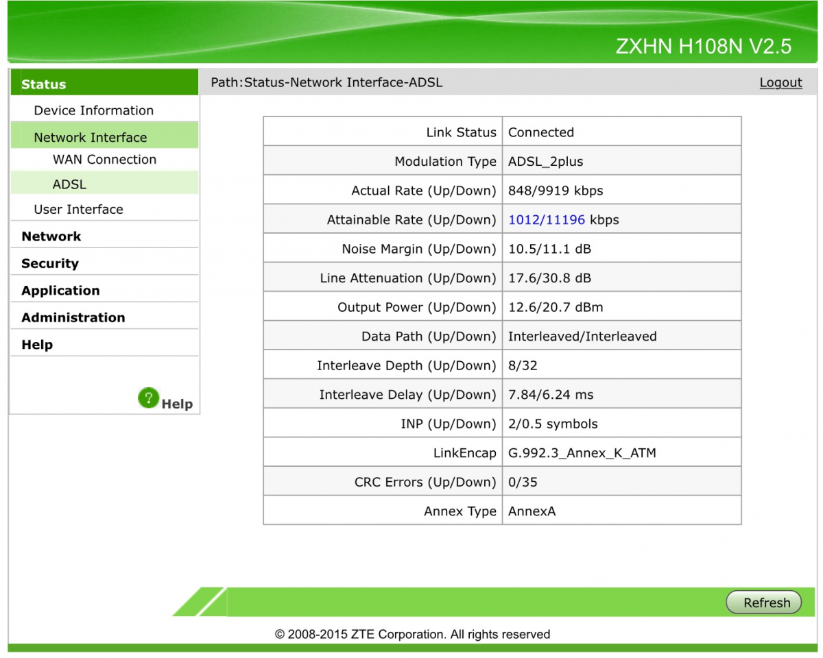 dionisis1925 Δημοσ. 27 Αυγούστου 2016 Δημοσ. 27 Αυγούστου 2016 Link Status Up Modulation Type ADSL_2plus Actual Rate(Up/Down) 1023/8191 kbps Attainable Rate(Up/Down) 1035/10128 kbps Noise Margin(Up/Down) 10.7/11.4 dB Line Attenuation(Up/Down) 20.2/32 dB Output Power(Up/Down) 12.1/19.7 dBm Data Path(Up/Down) Fast/Fast