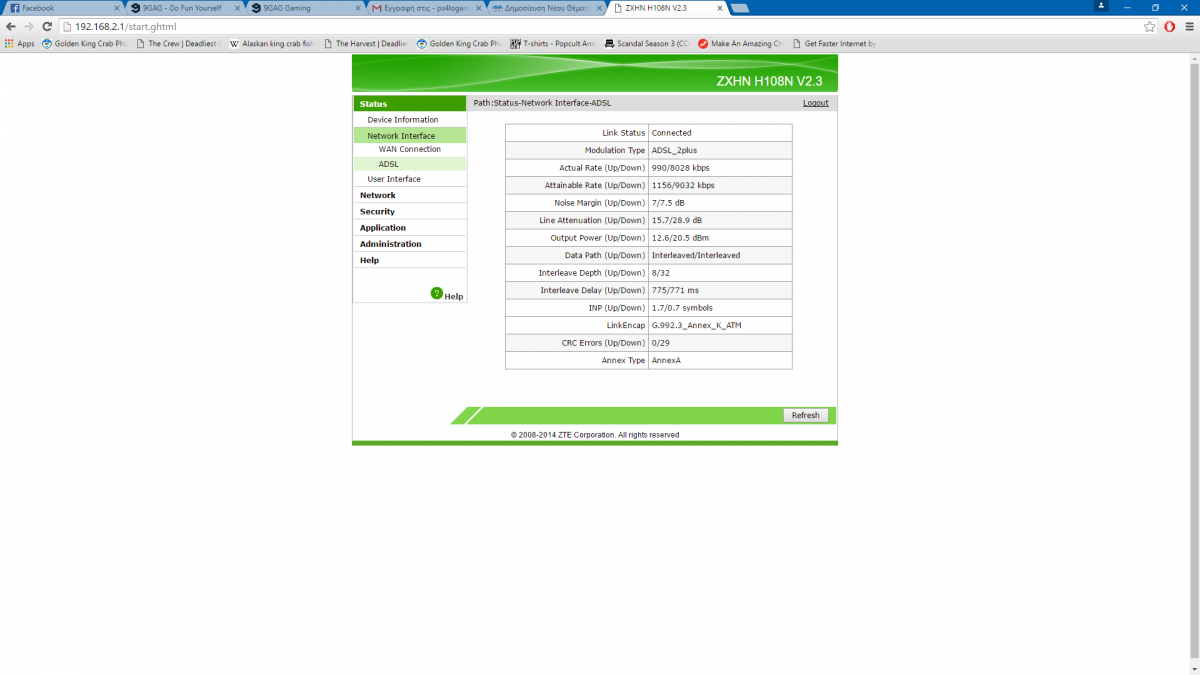 Xristaras12 Δημοσ. 12 Σεπτεμβρίου 2016 Δημοσ. 12 Σεπτεμβρίου 2016 επιασες 9+ γιατί το snr είναι στο 6 Στην πρώτη εικόνα αν δεις το snr ειναι 7.5 Παρ όλα αυτά για 29dB attenuation και πες 6snr θα επρεπε να ειχες κοντά στα 15Μbit θεωρητικό μέγιστο. Για την χαμηλότερη ταχύτητα με το asus ευθύνεται το chipset του dslam που συνδέεσαι(χοντρικά η κάρτα απ την μεριά του οτε που σου παρέχει ιντερνετ). Δηλαδή δεν είναι ιδια μάρκα και γι αυτό συγχρονίζει χαμηλότερα. Δεν ξέρω αν το συγκεκριμένο asus έχει την επιλογή να ρίξεις κ αλλο το snr για να πάρει παραπάνω η γραμμή αλλα θα γίνει ασταθής. Το πιθανότερο είναι πάντως εφόσον σου είπαν οτι παραπάνω απο 8-9 δεν μπορείς να πας,εχουν μπουκώσει η γραμμές και σας εχουν σε κλειδωμένα προφιλ για να μην γίνεται παραπάνω συγχρονισμός ΑΛΛΙΩΣ παλι λόγω πολλών χρηστών στο ίδιο κανάλι υπάρχει μεγάλο crosstalking και πέφτει ο συγχρονισμός. Απ την μεριά σου πάντως κάτι άλλο δεν μπορείς να κάνεις,εφόσον έχει ελεγχτεί η εσωτερική καλωδίωση και είναι εντάξει.