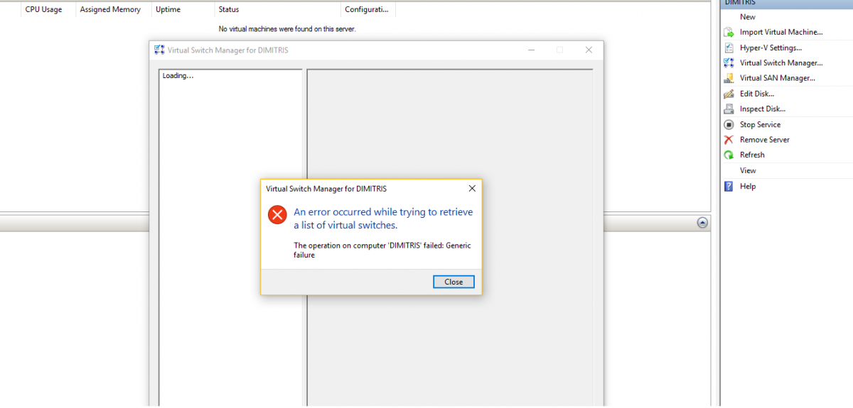 trendkill Δημοσ. 13 Σεπτεμβρίου 2016 Δημοσ. 13 Σεπτεμβρίου 2016 Καλησπερα σας, Εχω windows 10 pro και εχω εγκαταστησει το hyperv απο τα features στο control panel. Η μητρικη μου εχει ενεργοποιημενο το virtualization (vanderpool technology enabled). Ξεκιναω ανοιγοντας το virtual switch manager για να φτιαξω ενα virtual switch και μου πεταει το error: An error occurred while trying to retrieve a list of virtual switches. Πρεπει να ρυθμισω κατι στη καρτα δικτυου;