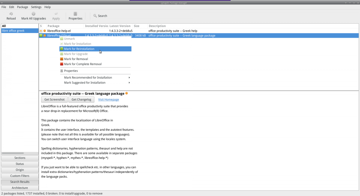 Le Perv Δημοσ. 1 Οκτωβρίου 2016 Δημοσ. 1 Οκτωβρίου 2016 Λοιπον, 1ον Ανοιγεις την εφαρμογη Synaptic. Δινεις τον κωδικο του διαχειριστη. Φορτωνει το Synaptic. 2ον Πανω αριστερα πατας Reload. Και περιμενεις να κανει ανανεωση απο internet. 3oν Πατας Search, οταν τελειωσει. Ειναι Πανω αριστερα, λιγο πιο δεξια. 4ον Πληκτρολογεις "libre office greek" και σου βγαζει αυτα τα αποτελεσματα 5ον Κανεις δεξι κλικ στο δευτερο αποτελεσμα και τσεκαρεις το Μark for installation 6ον Πατας Apply, Πανω στη μεση περιπου και περιμενεις να τελειωσει το κατεβασμα. 7ο το κλεινεις το Synaptic και ανοιγεις το Οffice Writer προγραμμα. 8ο πας ρυθμισεις μετα language και το αλλαζεις στα ελληνικα οπως στη φωτο 9ο κλεινεις το office και το ξανανοιγεις για να αλλαξει τη γλωσσα στα μενου 10ο Πας "Εργαλεια", "Γλωσσα", "Περισσοτερα δικτυακα Λεξικων" 11ο Ανοιγει το internet browser και μπαινει σε μια σελιδα με λεξικα. Ψαχνεις εκει για ελληνικα λεξικα Και μετα επεσα για υπνο. Δε μπορω να σε βοηθησω αλλο. Δε δουλευω οffice. Εχει φοβερα η διανομη, προεγκατεστημενα. Παιχνιδαρες, προγραμμα για backup και συγχρονισμο, προγραμμα για να περνας αρχεια και ρυθμισεις προγραμματων απο τον ενα χρηστη στον αλλο. Προγραμμα με gui για να ρυθμιζεις το GRUB. Προγραμμα για να σωζεις το λειτουργικο στη μορφη που το εχεις φερει και το καις σε DVD σαν δικη σου διανομη για μελλοντικη χρηση. Hash checker που ελεγχεις την αυθεντικοτητα των αρχειων, Καθαριστες αχρηστων αρχειων, αλα Ccleaner. Broadcom driver App που κανει τα Realtek wifi adapters να δουλευουν στα linux (υπαρχει ολοκληρο thread σ αυτο το φορυμ για αυτα τα προβληματα των Realtek k.a.) Στην ουσια βρισκει τον καταλληλο driver. Samba, firewall προεγκατεστημενα... Σιγα τα Ωα! Αλλα αυτο το πραγμα να μην εχει ελληνικα στα μενου, ελληνικη διανομη με ξεπερνα. Ειναι Debian based, οχι ubunt-oειδες. Εχει τα καλα, σταθεροτητα αλλα εχει και κακα (δεν ειναι συμβατο με ολα τα προγραμματα)