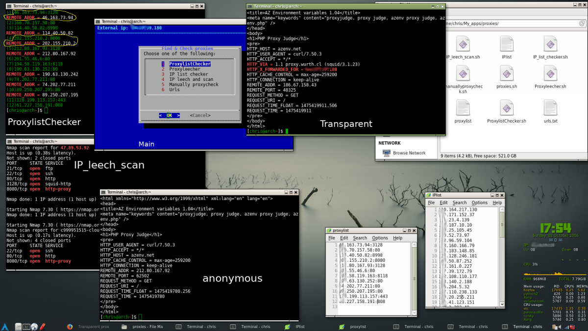 SV8XXX Δημοσ. 2 Οκτωβρίου 2016 Δημοσ. 2 Οκτωβρίου 2016 (επεξεργασμένο) Το script απαιτει εγκατεστημενα το "curl" και προαιρετικα το "nmap" E..και το "dialog" απαιτει επισεις να δηλωσετε το path του sctipt στο αρχειο proxies.sh, παραδειγμα: DIR="/home/chris/My_apps/proxies/" To 1,2 και το 5 απαιτουν curl To 3 απαιτει nmap To 4 απαιτει curl και nmap. Το script το τρεχουμε πηγαινοντας στο directory και ./proxies.sh Ηθελα ενα εργαλειο που ευκολα και γρηγορα θα μου εδεινε οταν χρειαζομουν εναν ανονυμο προξυ Εψαξα να βρω κατι ετοιμο αλλα οσα δοκιμασα η ηταν παναρχαια (και δεν δουλευαν) η δουλευαν αλλα οχι οπως ηθελα εγω. Καπως ετσι αρχισα να σκεφτομαι να φτιαξω ενα δικο μου.Τελικα εγινε και κανει τα εξης : 1) to ProxylistChecker, απο μια λιστα της μορφης: "proxy:port" (το αρχειο proxylist), ξεχωριζει τα ψωφια απο τα ζωντανα proxy και εαν κατα τη λειτουργια το ματι μας ειναι πανω στο script που τρεχει θα δουμε και θα καταλαβουμε ποιο ειναι και γρηγορο, απο τον ρυθμο ανταποκρισης του "curl" Παρατηρηστε οτι το script, αριθμει την proxylist, για την καθε ip:port προσπαθει να κανει συνδεση σε ενα proxy judge που εχουμε ορισει, αν παρει απαντηση μας επιστρεφει το REMOTE_ADDR= σημαδι οτι ο server ανταποκρινετε. Αν δεν πετυχει συνδεση προχωραει για την επομενη. Εμεις τωρα παμε στην απο πανω σειρα απο το "REMOTE_ADDR=IP.ΧΧ.ΧΧΧ.ΧΧ", που υπαρχει η ιδια ip και το port και τα ανιγραφουμε. Μεχρι εδω τσεκαραμε αν ο σερβερ ειναι ζωντανος.Δεν ξερουμε αν ειναι ανονυμος! Για να δουμε αν ειναι ανονυμος επιλεγουμε την επιλογη 5 Manually proxycheck την τρεχουμε και μας ζηταει να γραψουμε την ip:port,κανουμε επικολληση, παταμε enter. Το script θα παει και θα φερει την εξωτερικη μας ip και θα την συγκρινει με την επιστροφη του proxy judge. Αν δουμε το παραθυρο της φωτο χωρις κοκκινα στην επιστροφη του proxy judge ο proxy ειναι ανονυμος. Αν στην επιστροφη του proxy judge υπαρχει η "ip μας" ή το "HTTP_VIA=" ο proxy σημαινεται με κοκκινα και ειναι transparent Το Proxyleecher σκαναρει μια συγκεκριμενη ιστοσελιδα για proxies και φτιαχνει το αρχειο proxylist To IP leech and scan, μας ζηταει να δωσουμε ενα url σελιδα με proxies Προσοχη κοιταμε με το view page source για ips ακρυπτογραφητες. Κατεβαζει την IPlist και το "nmap" την σκαναρει για πορτες που εχουμε ορισει. Βρισκουμε ips με open ports τις δοκιμαζουμε με την 5η επιλογη IP list checker μονο δοκιμαζει την IPlist δεν κατεβαζει καινουργια. proxies.tar.gz Επεξ/σία 2 Οκτωβρίου 2016 από SV8XXX 1