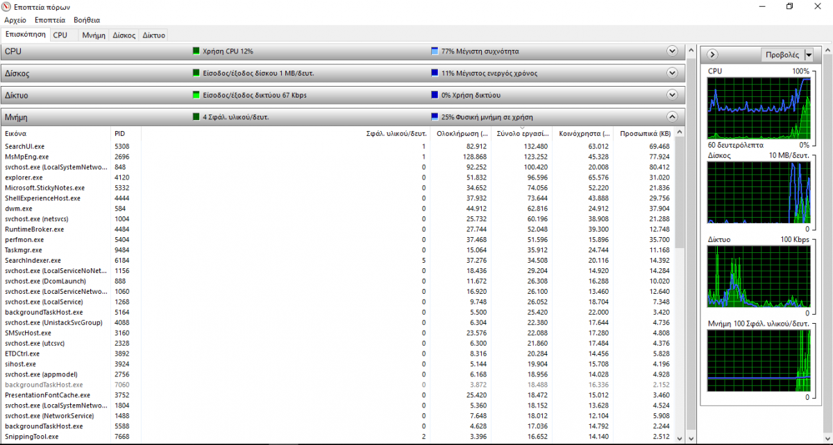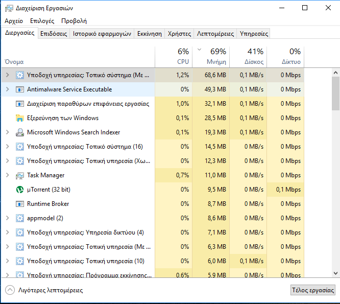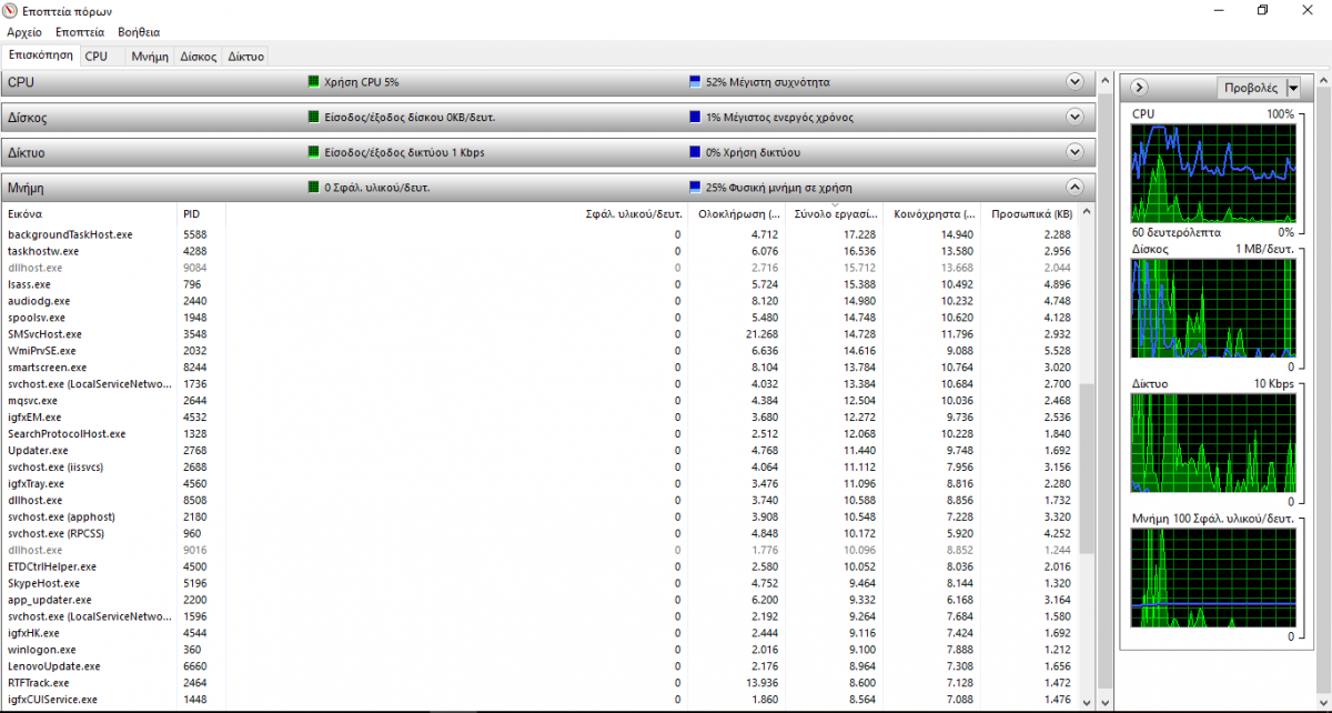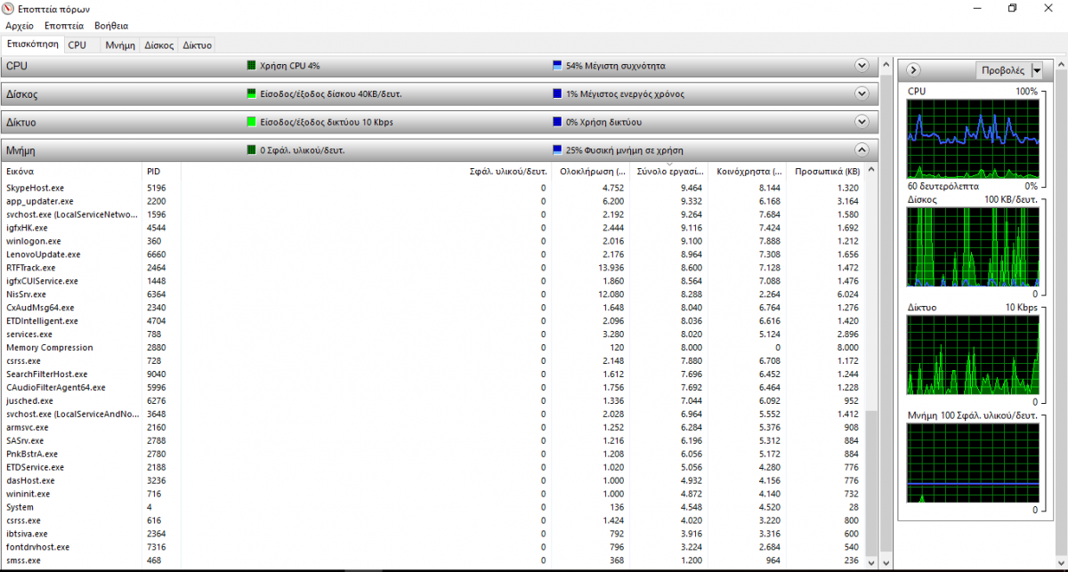 kostask91 Δημοσ. 11 Οκτωβρίου 2016 Μέλος Δημοσ. 11 Οκτωβρίου 2016 Καταρχην ευχαριστω για τις απαντησεις σας. Πατα τη δευτερη καρτελα "Eπιδοσεις" και κατω αριστερα εχει ενα που στα αγγλικα λεγεται "Resource monitor".Βγαλε ενα screenshot απο αυτο, λογικα η gpu σου τρωει αρκετη ram. Λοιπον εκανα ενα restart και επεσε στο κανονικο. Gpu δεν υπαρχει , εχει την ενσωματωμενη του i3. Εβγαλα 3 screenshots με ολη τη λιστα. Και το restart να εφταιγε, αυτο το πραμα γινεται τις τελευταιες μερες, ποτε αλλοτε δεν ειχα αυτο το προβλημα, και ας μην ειχα κλεισει το pc. Δειξε πιο πληρη κατασταση "70% χωρις να εχω ανοιχτο τιποτα?" -- τι τιποτα ρε αδελφε..εδω βλεπω antimalware service , mtorrent , opera / skype / bsplayer που λες και δεν τα βλεπουμε..δεν τα λες και τιποτα.. Πιο πληρη κατασταση αλλιως δεν ειναι ετσι τα πραγματα. Το antimalware service ειναι λεει υπηρεσια του windows defender. Με τα opera, skype κτλ που αναφερω φτανει στο 98%, στο 70% ειναι χωρις αυτα, μονο με οσα φαινονται. Και ξαναλεω, οτι με το restart εστρωσε, αλλα αυτο το προβλημα το αντιμετωπιζω τις τελευταιες μερες, κανοντας ακριβως την ιδια χρηση.
