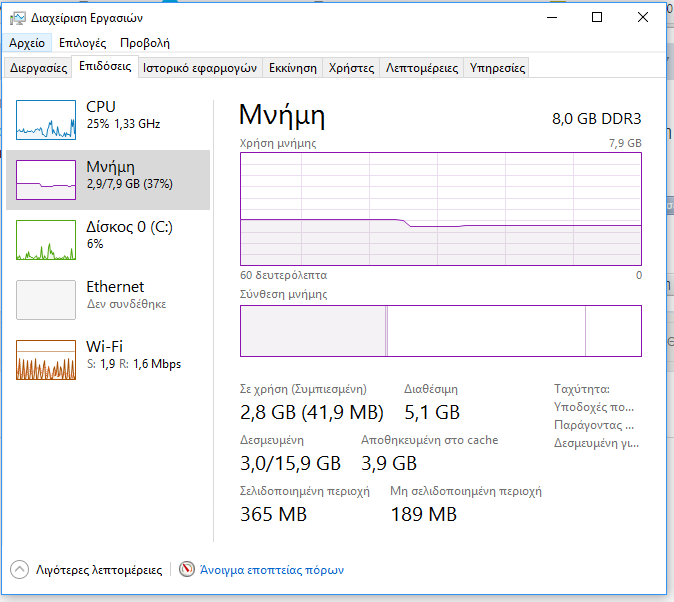 thepoint Δημοσ. 11 Οκτωβρίου 2016 Δημοσ. 11 Οκτωβρίου 2016 Εύκολο παρατήρησε στο πρώτο screenshot που ανάρτησες έχεις επιλέξει διεργασίες θα πατήσεις επιδόσεις η δεύτερη ετικέτα και μνήμη εκεί θα το δεις στο κάτω μέρος ή κάνεις ένα ακόμα screenshot