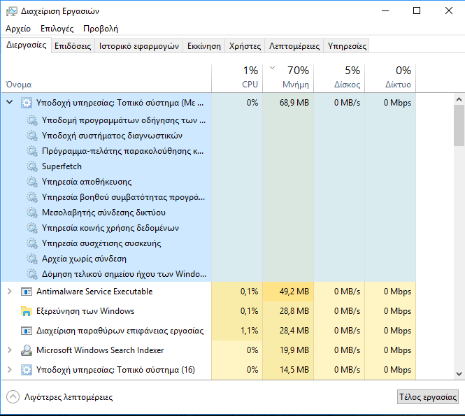 kostask91 Δημοσ. 11 Οκτωβρίου 2016 Δημοσ. 11 Οκτωβρίου 2016 Καλησπερα σας. Τις τελευταιες μερες παρατηρησα οτι το laptop μου σερνεται λιγο και μου φανηκε παραξενο. Και ανοιξα τη διαχειριση εργασιων και τι να δω? Χαος. 98% ram usage με ανοιχτο hearthstone, 4-5 καρτελες στον opera, skype και bsplayer. Γενικα παντα αυτα εχω ανοιχτα πανω κατω οταν παιζω hearthstone, αλλα ποτε δεν κολλησε και δεν εφτασε σε τοσο υψηλο ποσοστο usage, απο τοτε που το εκανα αναβαθμιση (απο 4GB σε 8 GB ram). Μετα εκλεισα hearthstone και opera και ειδα το παρακατω "τρομακτικο": 70% χωρις να εχω ανοιχτο τιποτα???? Γενικα απο τοτε που εβαλα windows 10, δεν εχω ασχοληθει και πολυ οποτε δεν εχω ιδεα τι ειναι ολα αυτα στην διαχειριση εργασιων. Μπορει να ριξει καποιος μια ματια να μου πει τι μπορει να φταιει , αν και τις τελευταιες μερες γινεται αυτο.